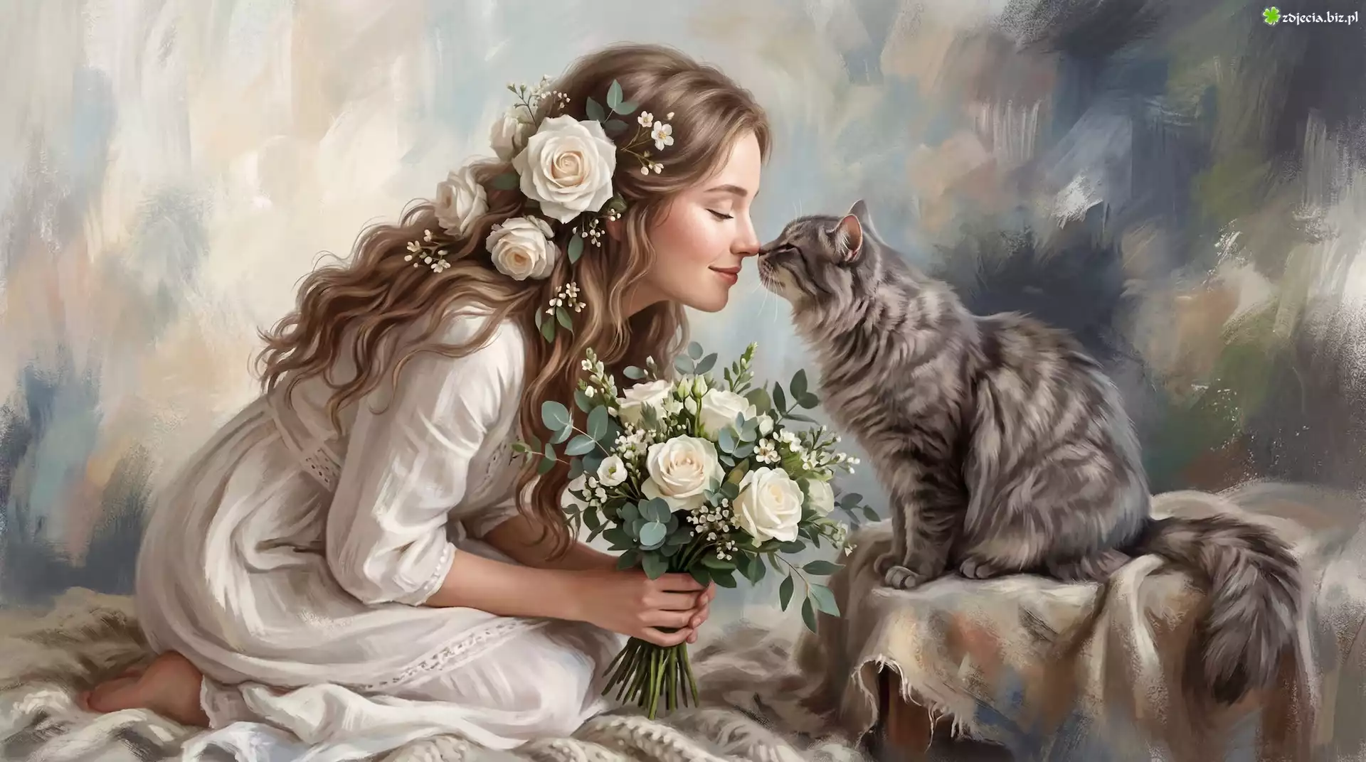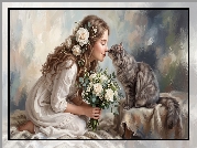 Zdjęcie Dziewczyna, Kwiaty, Róże, Kot, Grafika