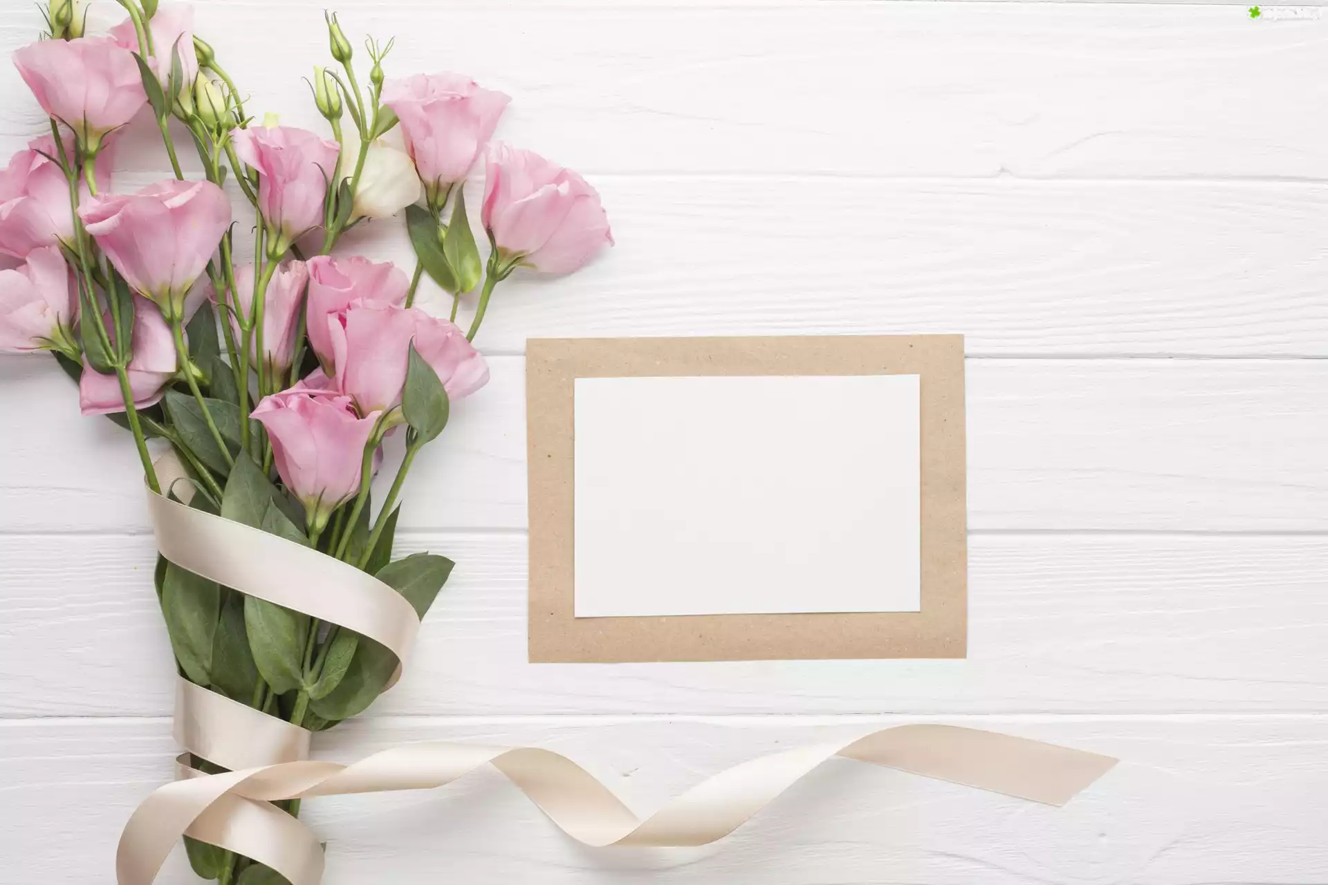 Zdjęcie, Różowe, Kwiaty, Eustoma, Wstążka, Ramka, Białe, Deski