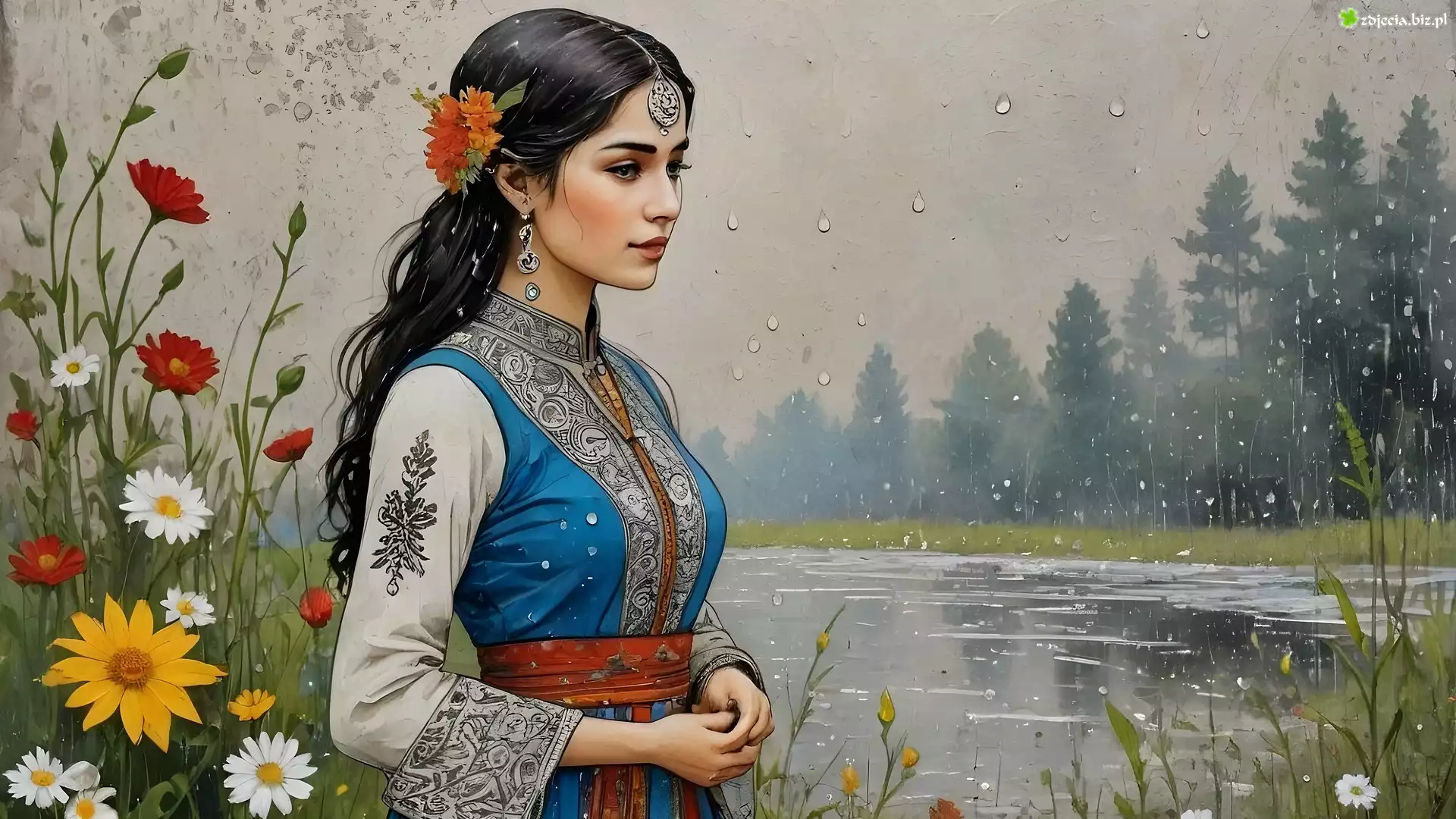 Zdjęcie Kobieta, Brunetka, Rzeka, Kwiaty, Drzewa, Deszcz, Grafika