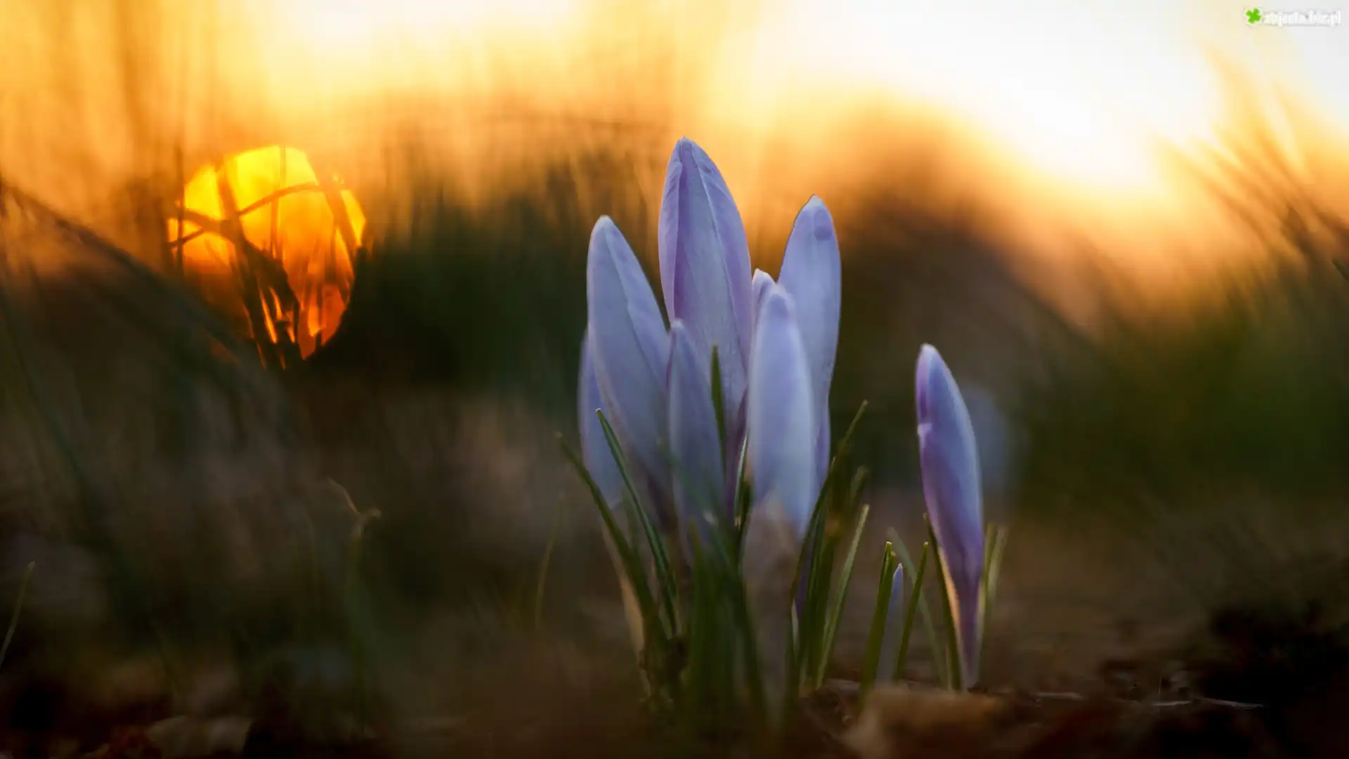 Zdjęcie Kwiaty, Krokus, Trawa, Zachód słońca, Rozmycie
