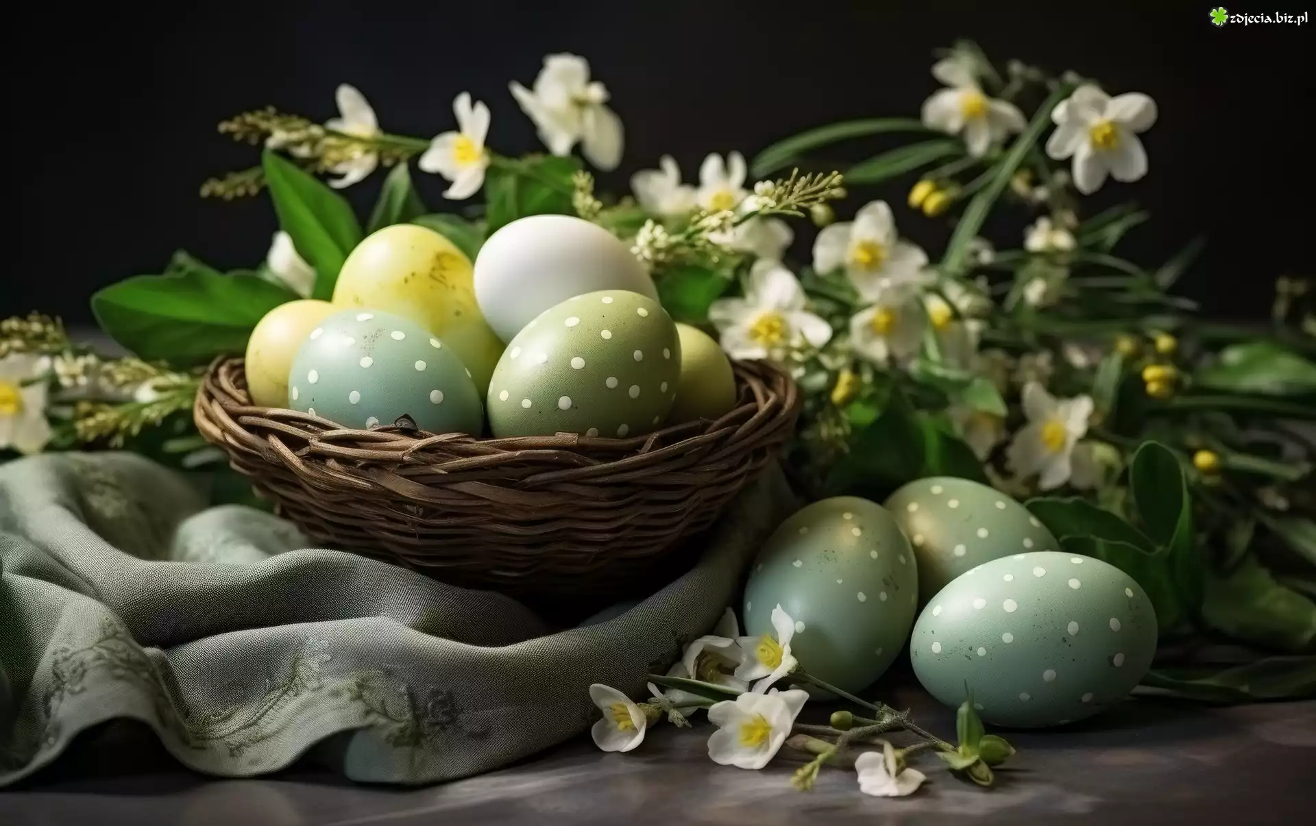Zdjęcie Wielkanoc, Pisanki, Koszyk, Kwiaty, Materiał, Stół