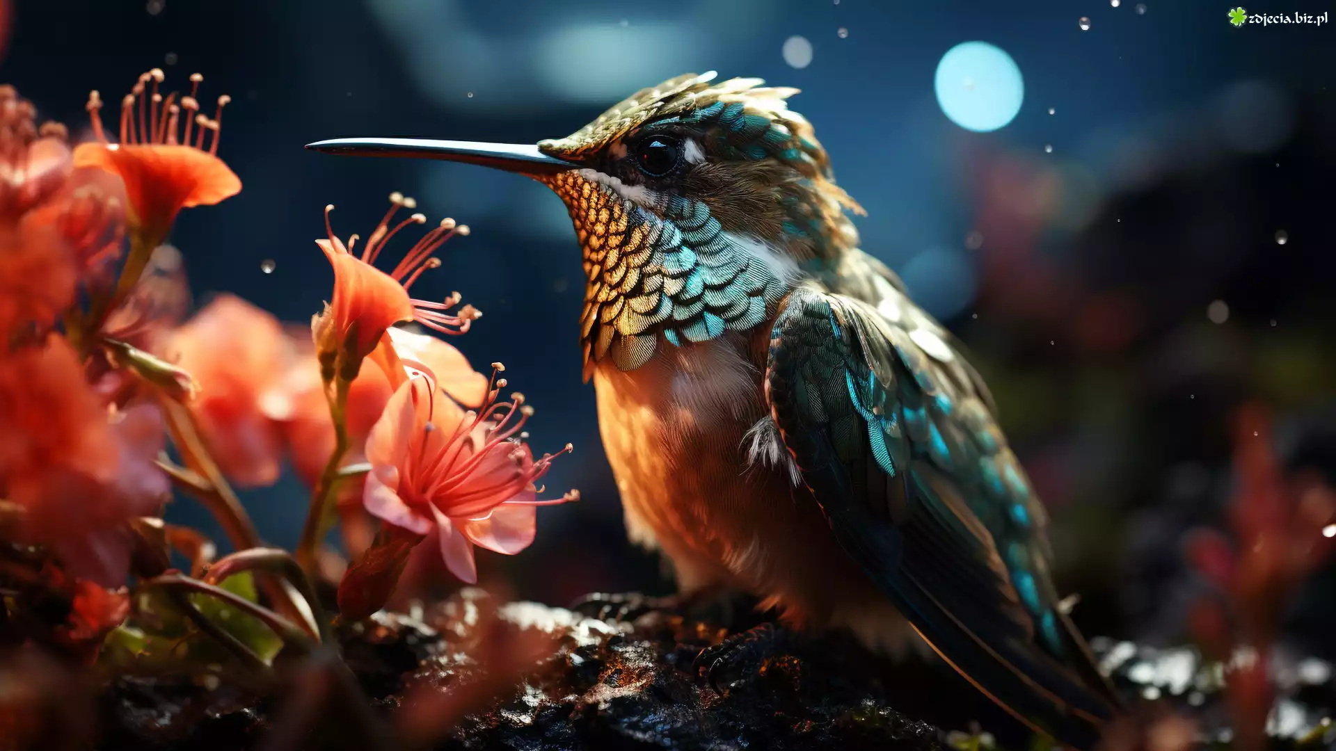 Zdjęcie Ptak, Koliber, Pomarańczowe, Kwiaty, Ciemne tło