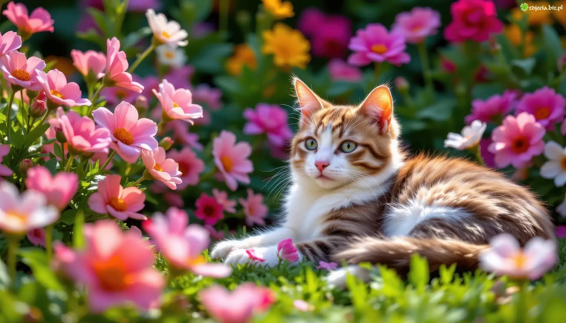 Zdjęcie Kwiaty, Kot, Trawa