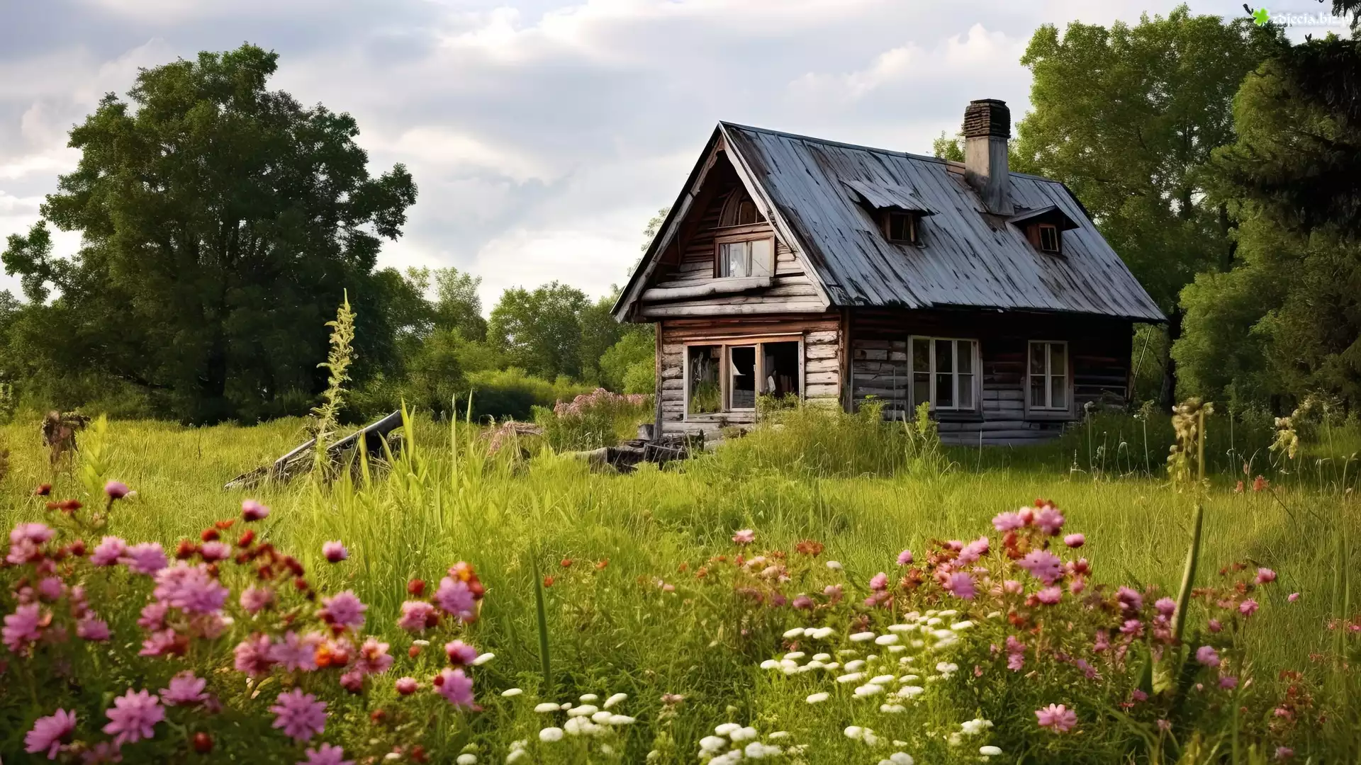 Zdjęcie Drewniany, Dom, Łąka, Kwiaty, Drzewa, Trawa