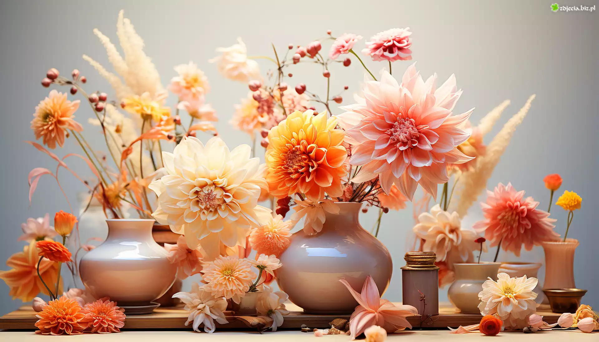 Zdjęcie, Kwiaty, Dalie, Wazony