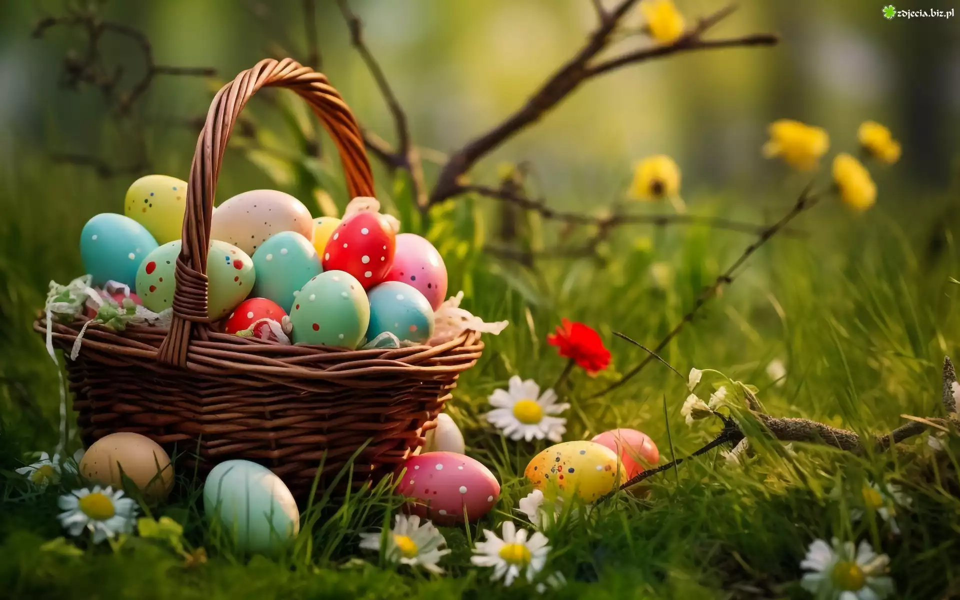 Zdjęcie Koszyk, Kolorowe, Pisanki, Kwiaty, Trawa, Wielkanoc