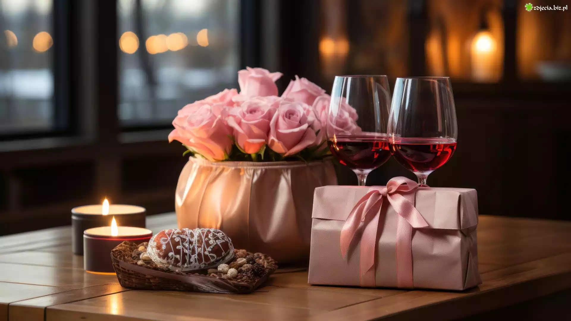 Zdjęcie Kwiaty, Różowe, Róże, Bukiet, Prezent, Kieliszki, Wino, Ciasteczka, Świeczki