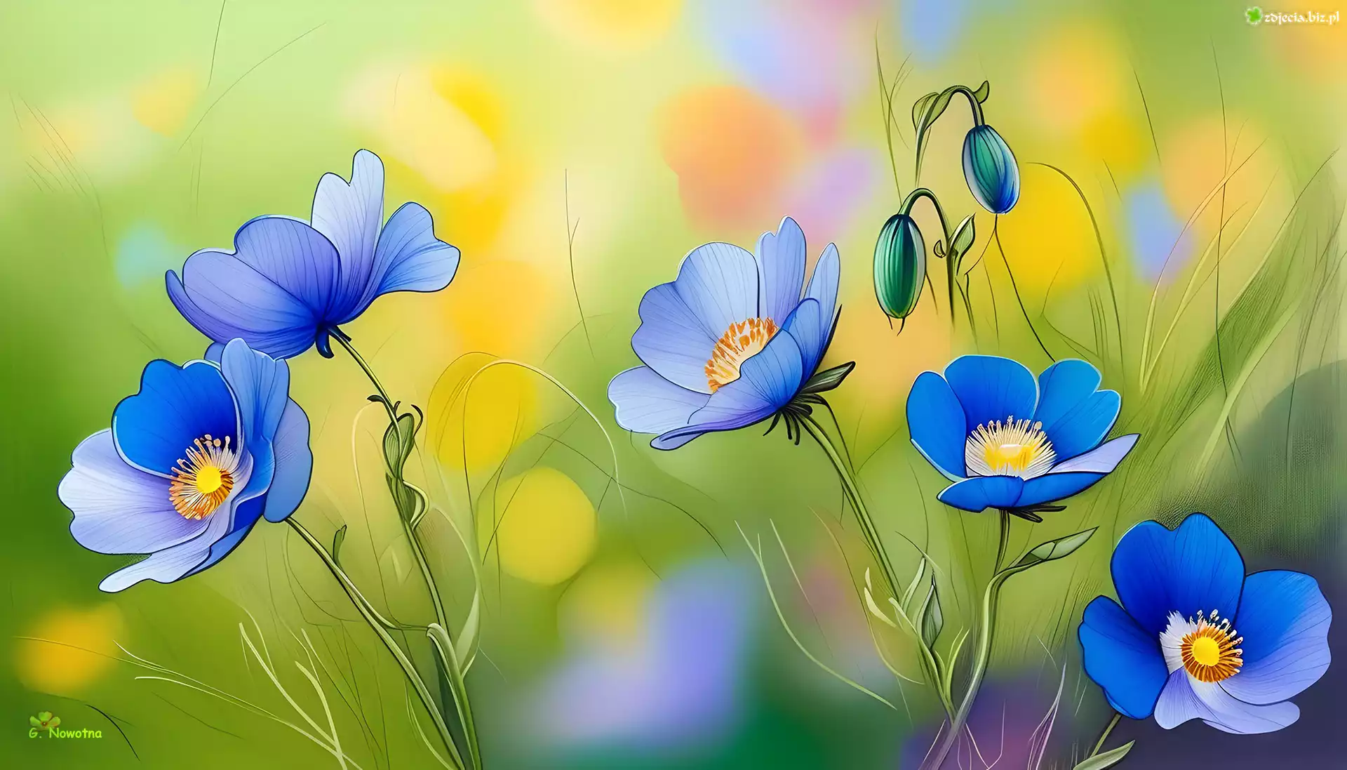 Zdjęcie Niebieskie, Kwiaty, Zielone, Tło, Grafika