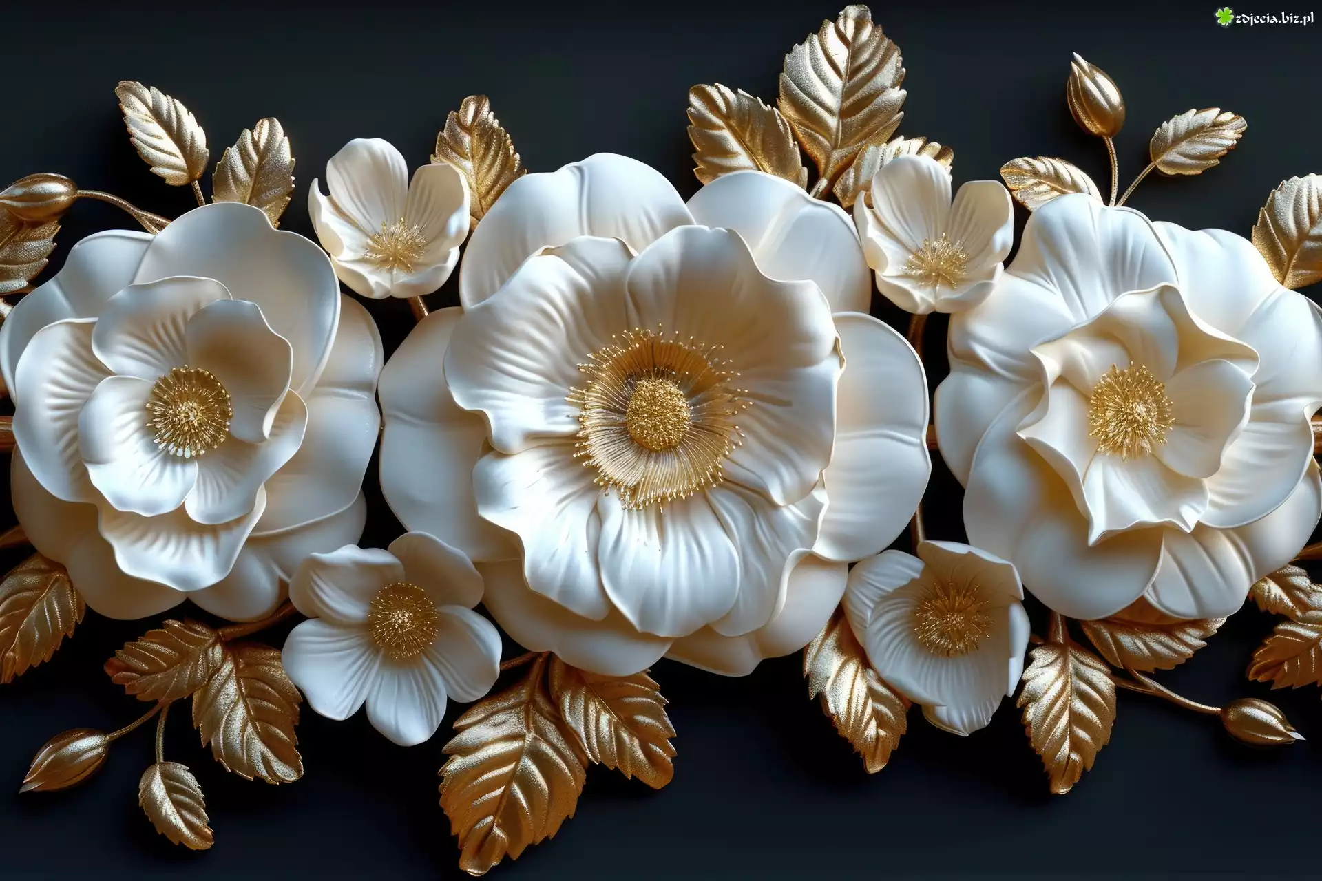 Zdjęcie Białe, Kwiaty, Złote, Listki, Grafika