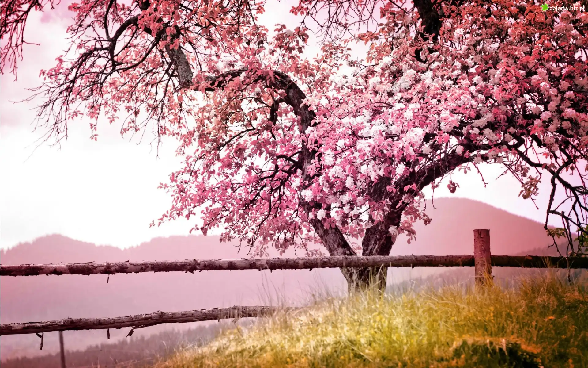 Zdjęcie Kwitnące, Drzewo, Ogrodzenie, Góry, Łąka, Poranek