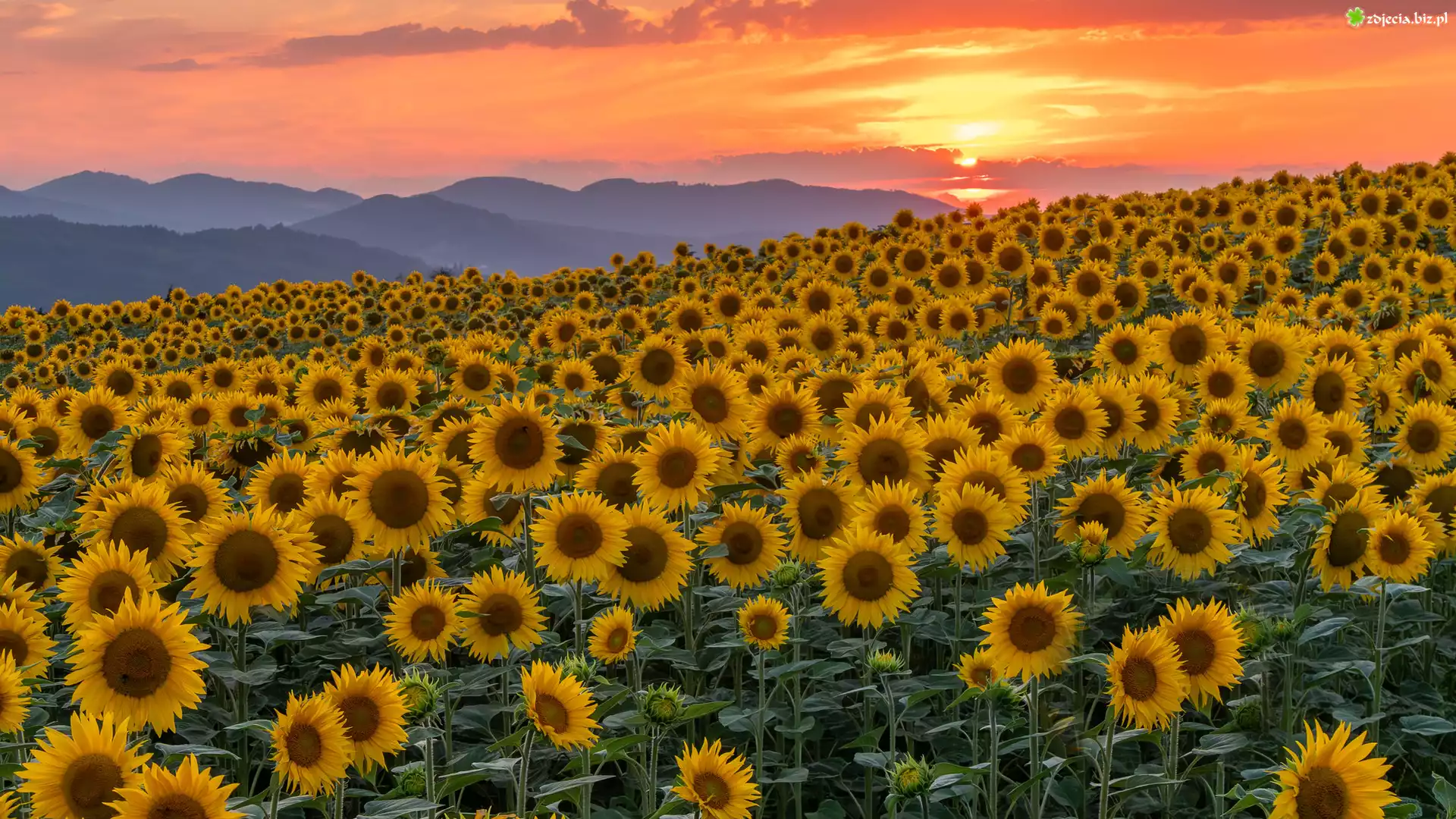 Zdjęcie Pole, Kwitnące, Słoneczniki, Zachód słońca