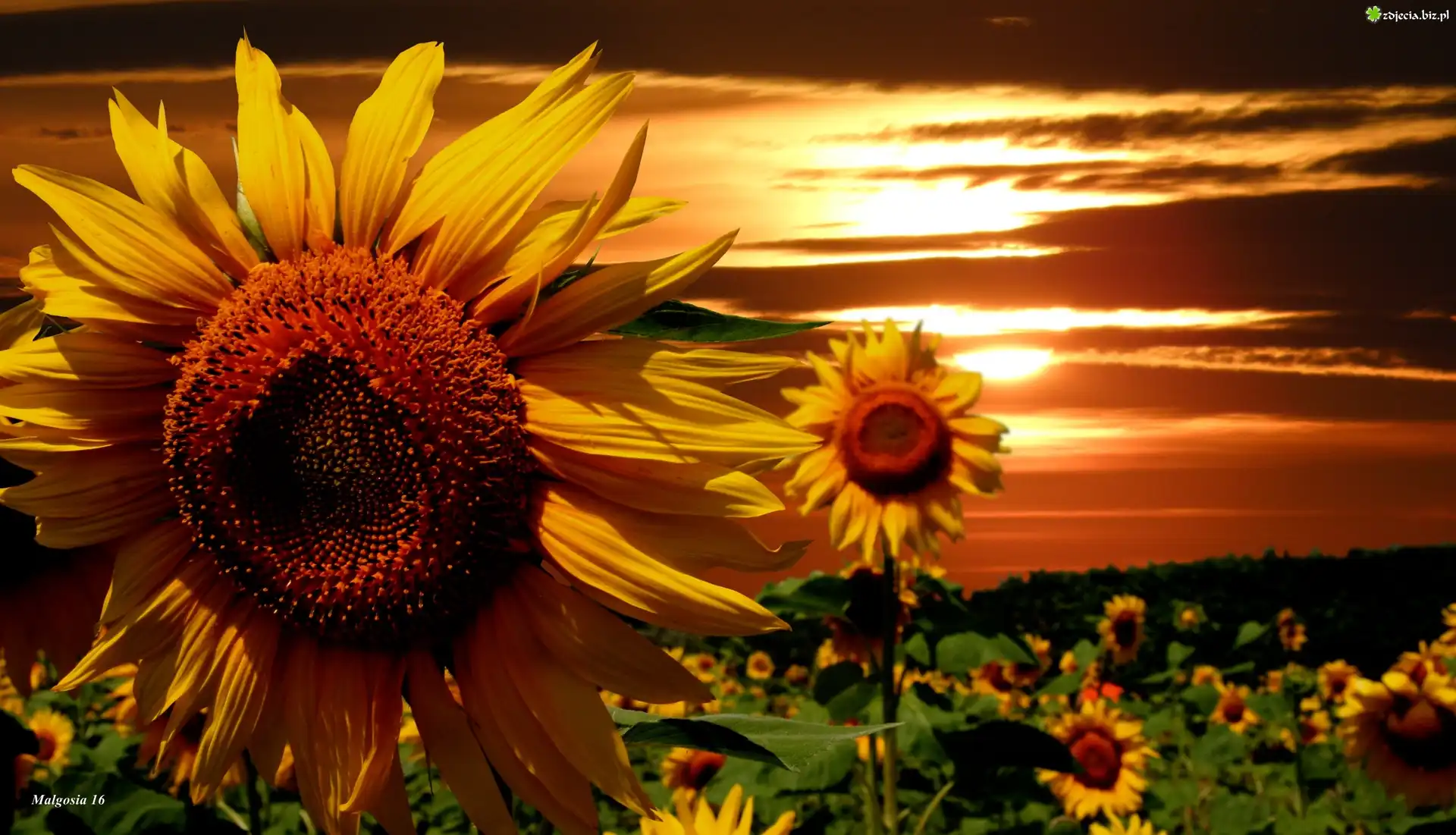 Zdjęcie Kwitnące, Słoneczniki, Zachód Słońca