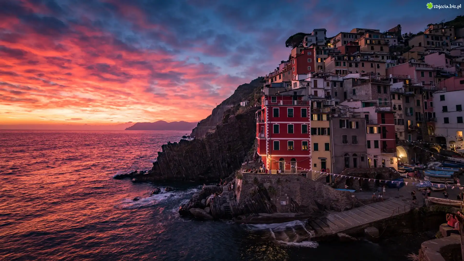 Zdjęcie Włochy, Prowincja La Spezia, Riomaggiore, Domy, Morze, Skały, Chmury, Zachód słońca