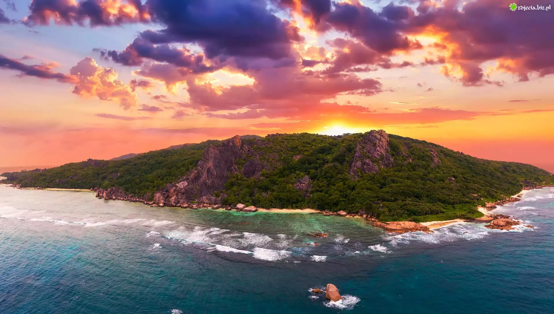Zdjęcie Seszele, Góry, Wyspa, La Digue, Morze, Anse Source dArgent, Skały, Zachód słońca, Chmury |