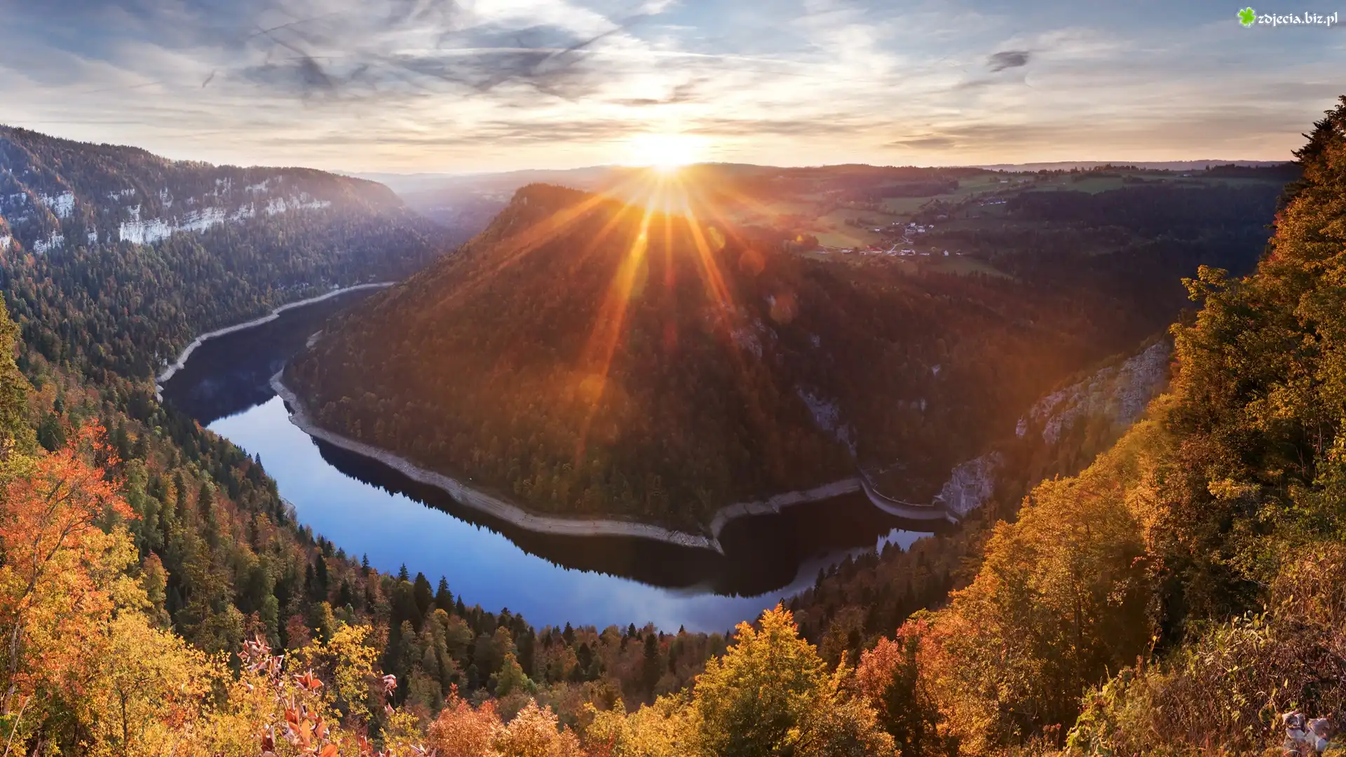 Zdjęcie Szwajcaria, Neuchatel, Wzgórza, Jezioro, Lac de Moron, Tama Chatelot, Drzewa, Jesień, Las, Promienie słońca |