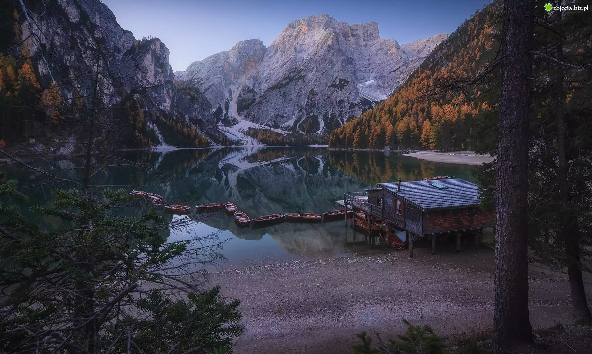 Zdjęcie Włochy, Południowy Tyrol, Jezioro Pragser Wildsee, Lago di Braies, Góry Dolomity, Pomost, Drewniany, Domek, Łódki, Drzewa |