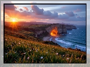 Zdjęcie, Łąka, Zbocze, Klif, Jaskinia, Światło, Morze, Zachód słońca, Grafika AI