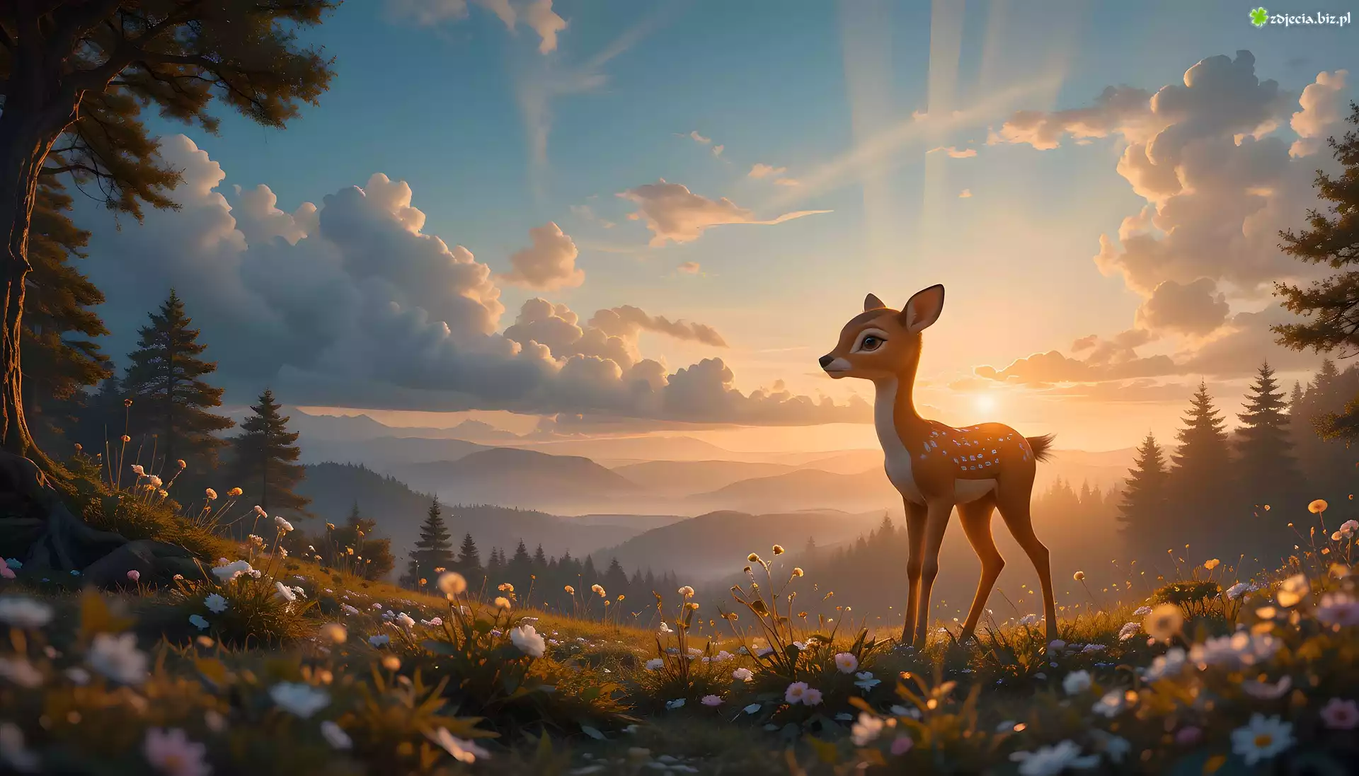 Zdjęcie Jelonek, Łąka, Kwiaty, Góry, Chmury