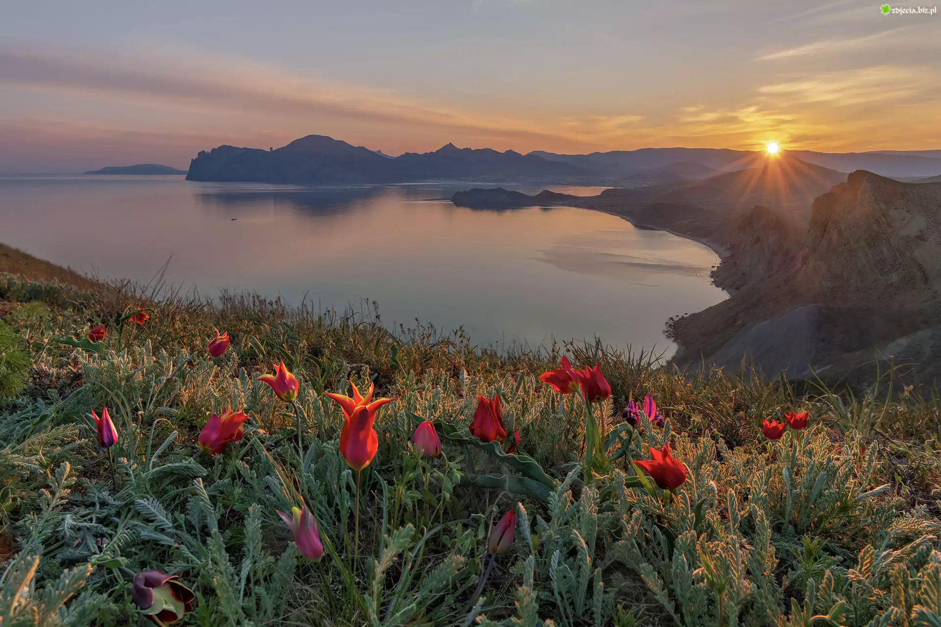 Zdjęcie Zachód słońca, Krym, Morze Czarne, Góry, Łąka, Kwiaty, Czerwone, Tulipany, Rośliny