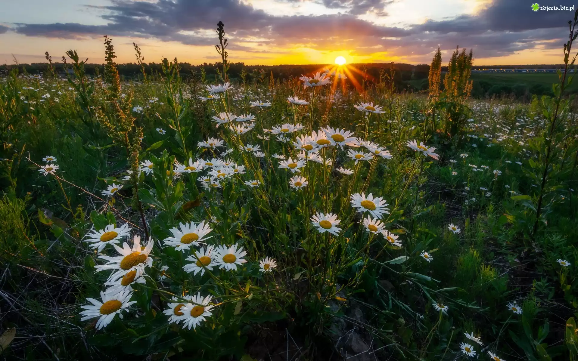 Zdjęcie Pole, Kwiaty, Margerytki, Lato, Chmury, Zachód słońca, Łąka