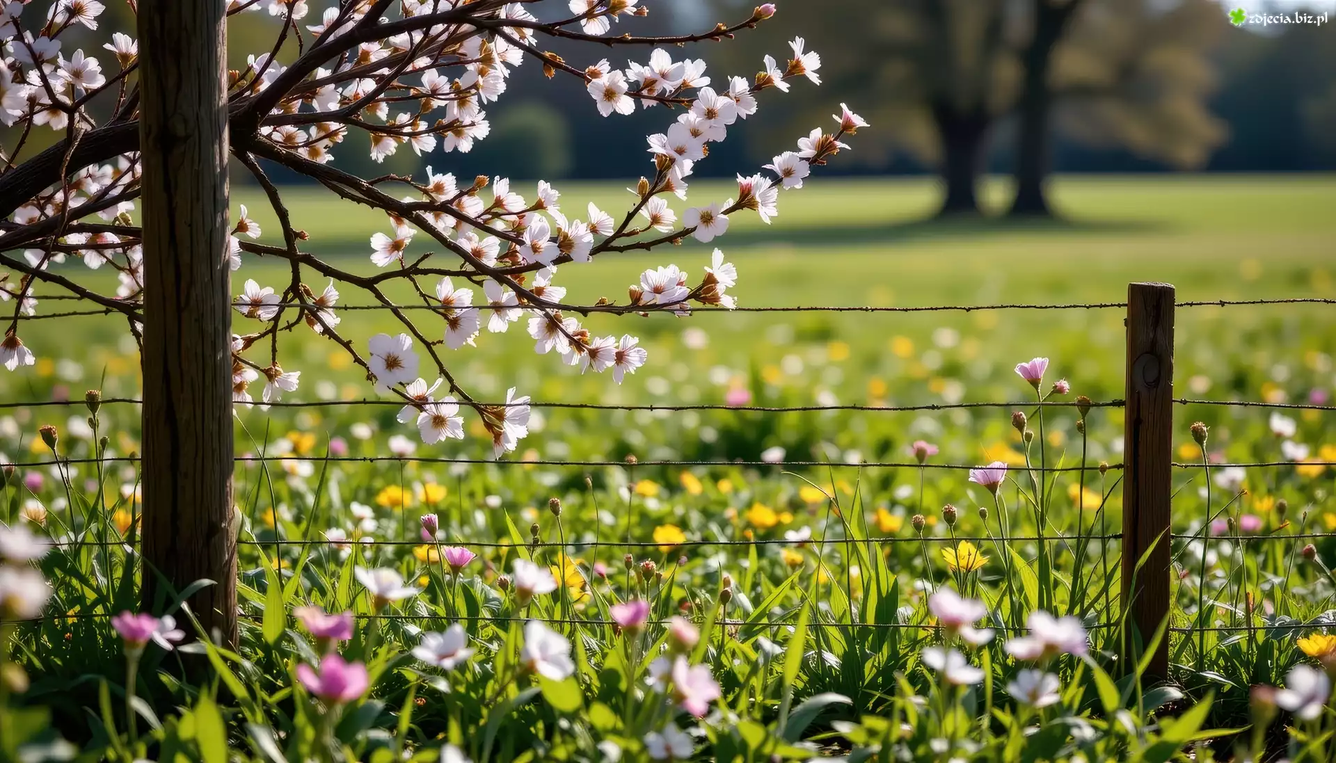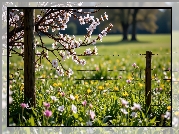 Zdjęcie Wiosna, Ukwiecone, Gałązki, Łąka, Kwiaty, Ogrodzenie