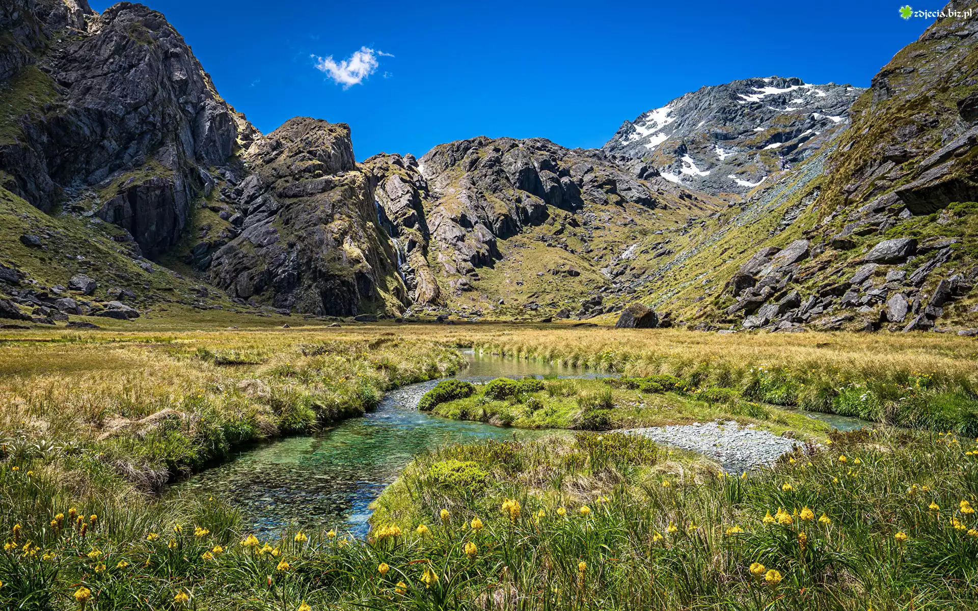 Zdjęcie Góry, Skały, Rzeka, Łąka, Trawa, Kwiaty, Niebo