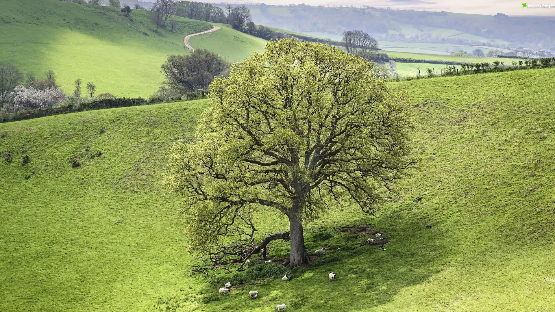 Zdjęcie Drzewo, Łąka, Trawa, Owce, Wzgórze