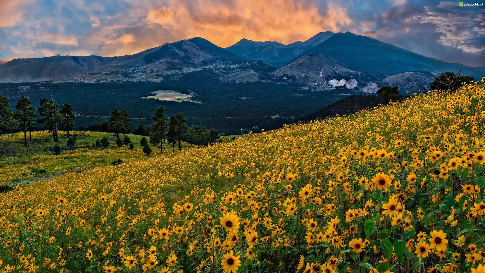 Zdjęcie Góry, Łąka, Żółte, Kwiaty, Wzgórze