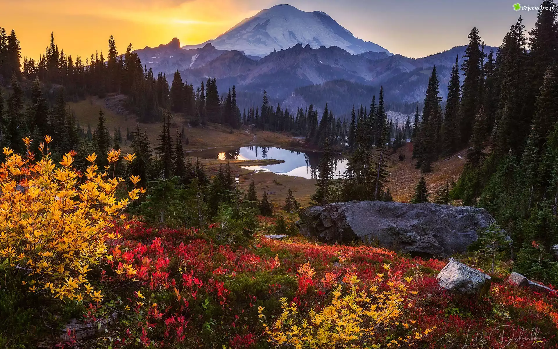 Zdjęcie Zachód słońca, Stratowulkan Mount Rainier, Jezioro, Tipsoo Lake, Waszyngton, Stany Zjednoczone, Drzewa, Skała, Krzewy, Góry |