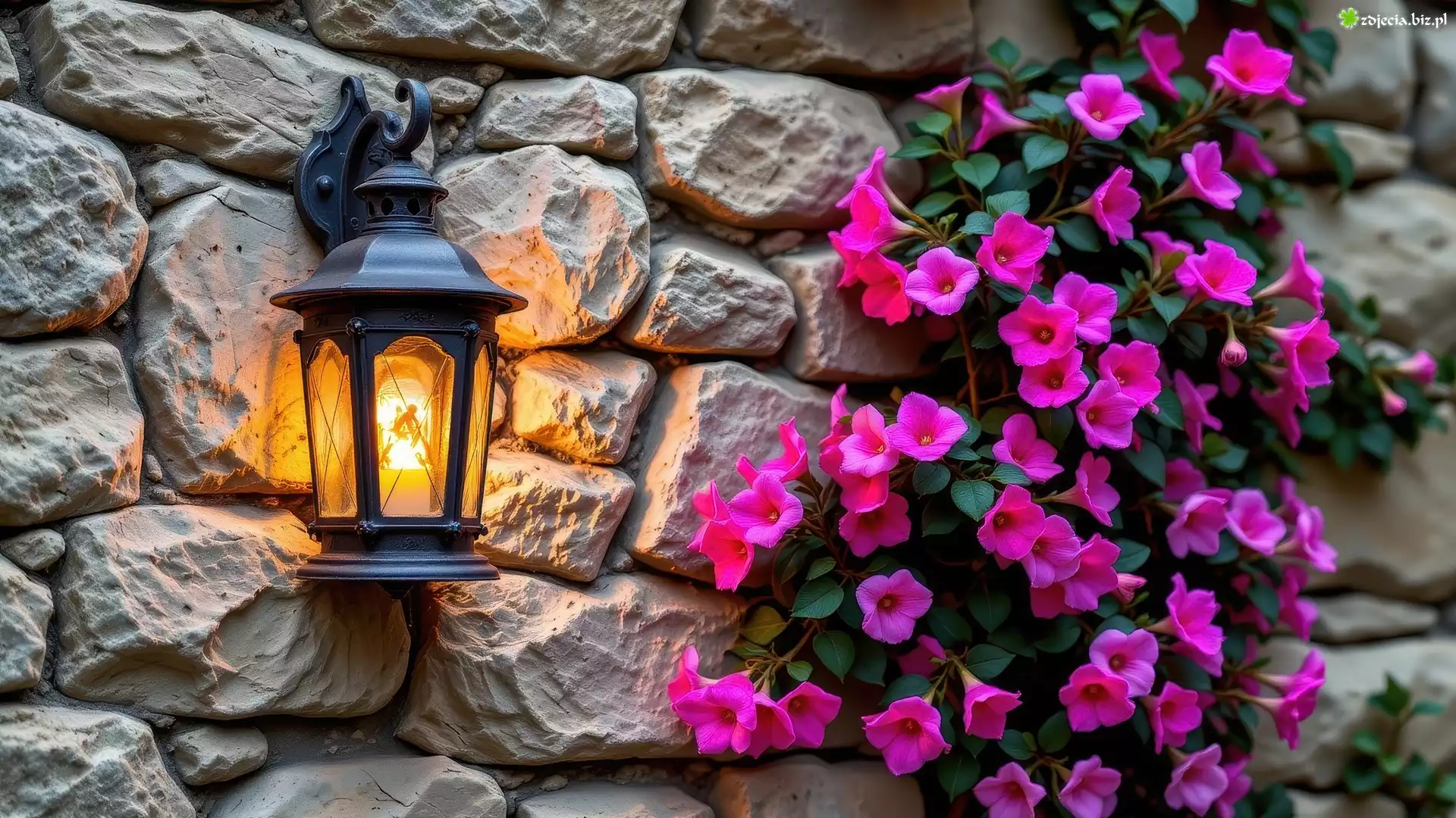 Zdjęcie Murowana, Ściana, Świecąca, Lampa, Purpurowe, Kwiaty