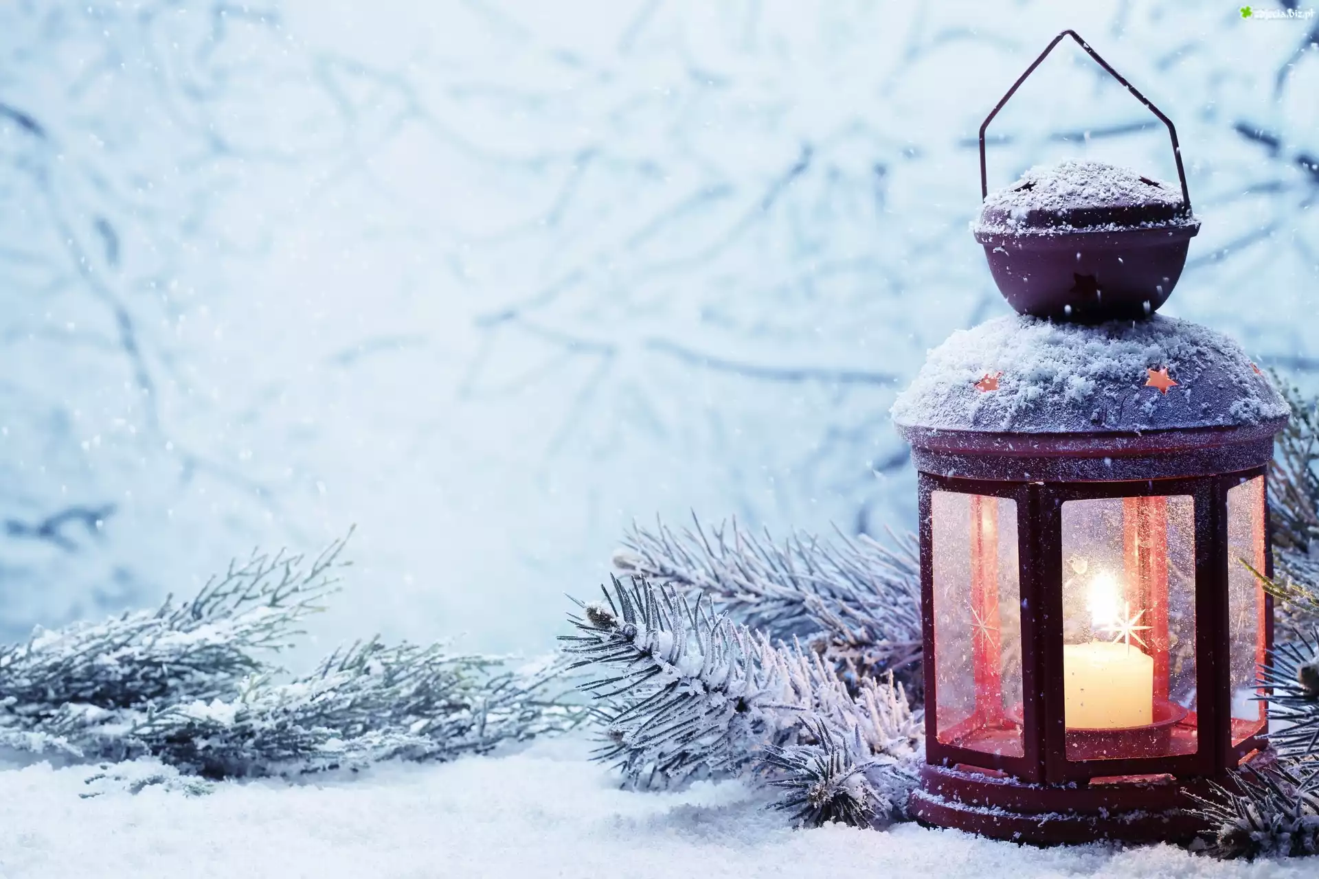 Zdjęcie Lampion, Świeca, Gałązki, Śnieg, Dekoracja