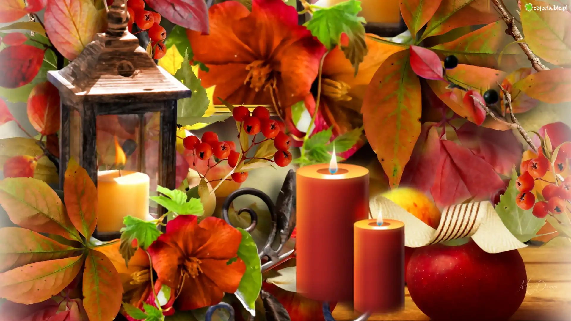 Zdjęcie Kompozycja, Lampion, Świece, Liście, Kwiaty, Jarzębina, Jabłko