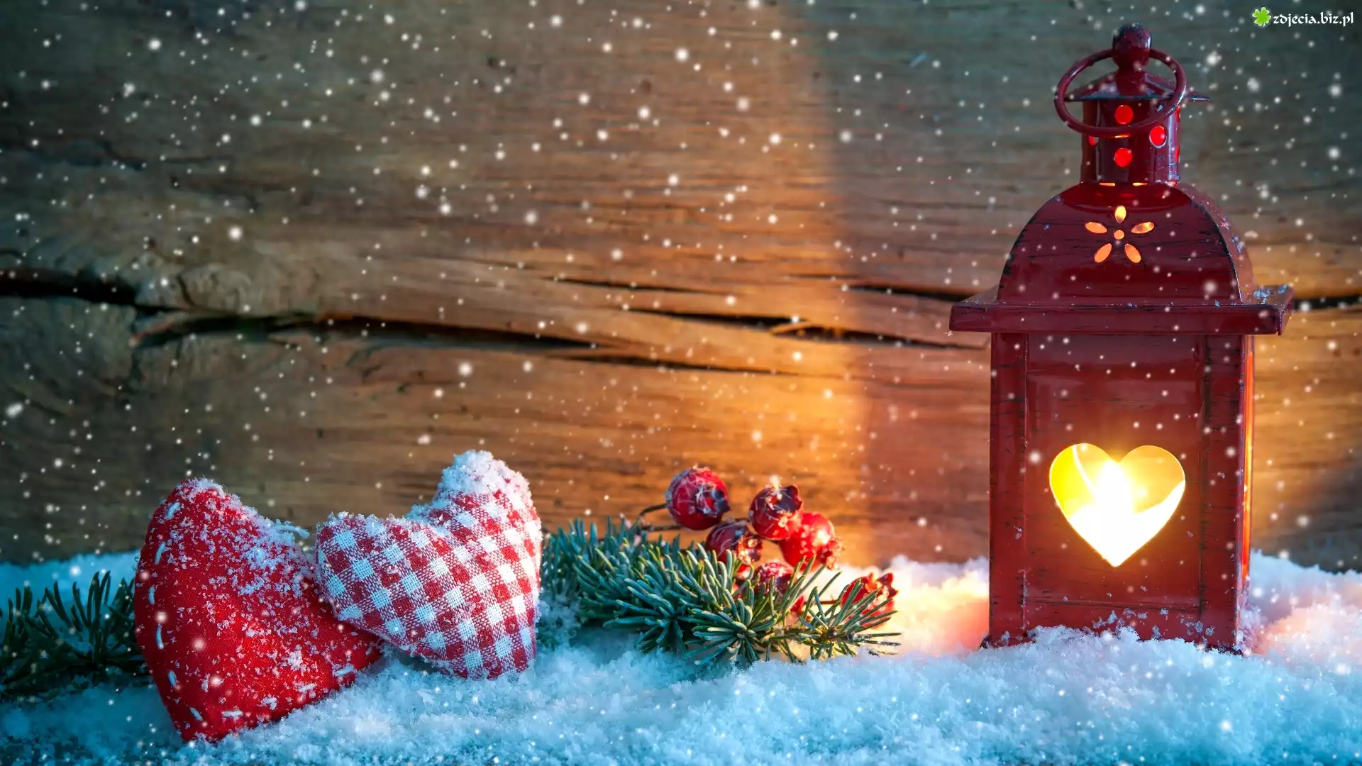 Zdjęcie Lampion, Gałązki, Poduszeczki, Serca, Śnieg, Boże Narodzenie, Kompozycja, Świeca