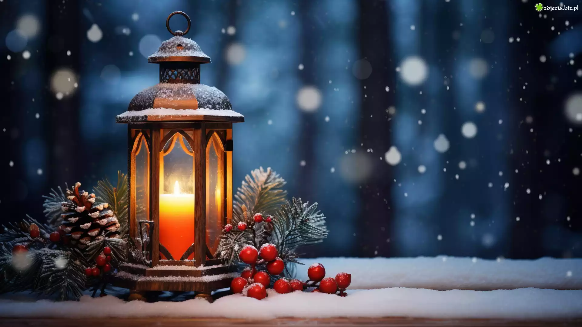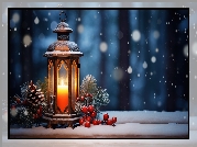 Zdjęcie Zima, Lampion, Świeca, Szyszki, Śnieg