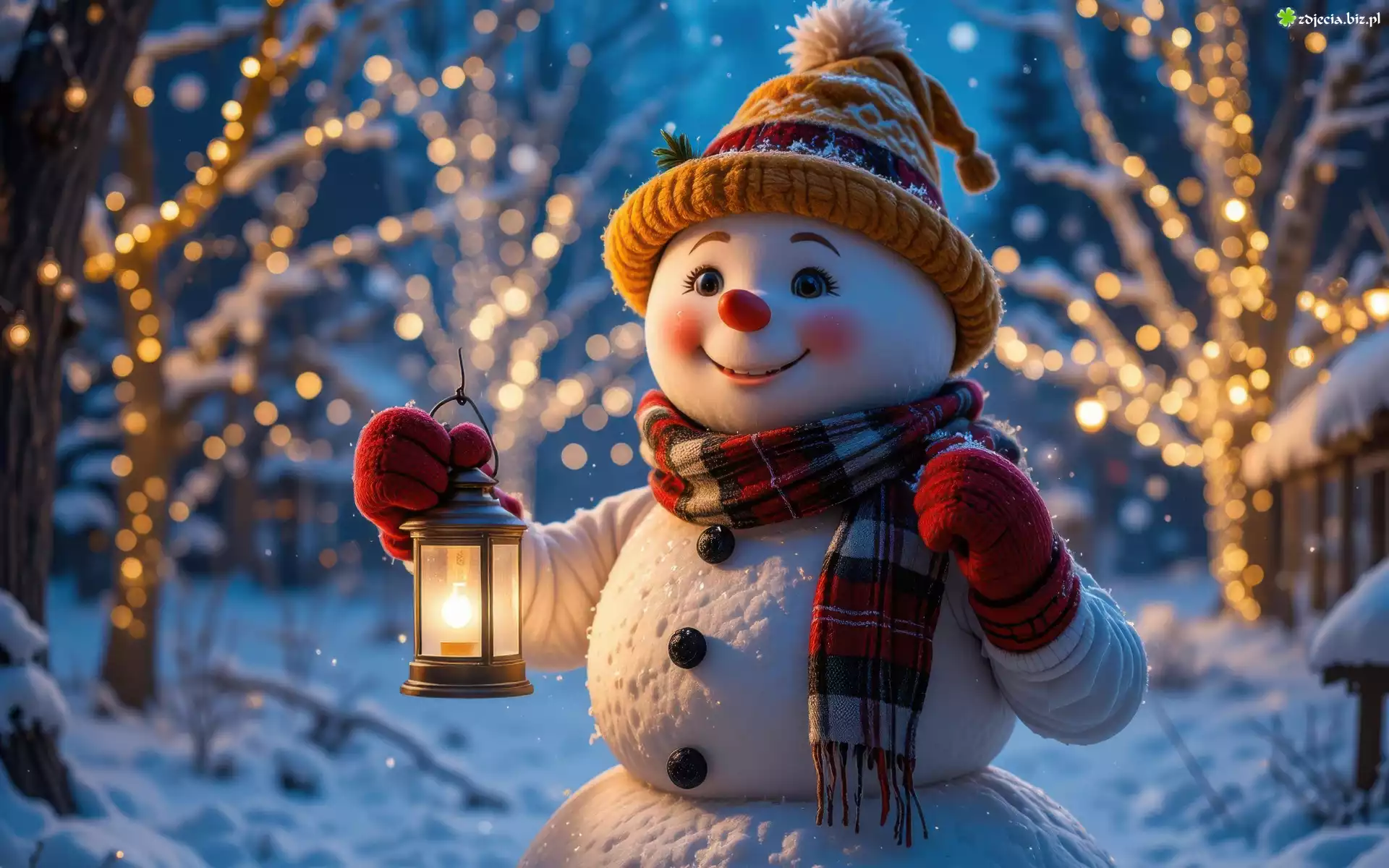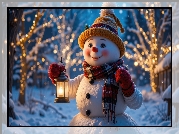 Zdjęcie Zima, Śnieg, Bałwanek, Czapka, Szalik, Rękawiczki, Lampion, Uśmiech, Drzewa, Girlandy, AI |