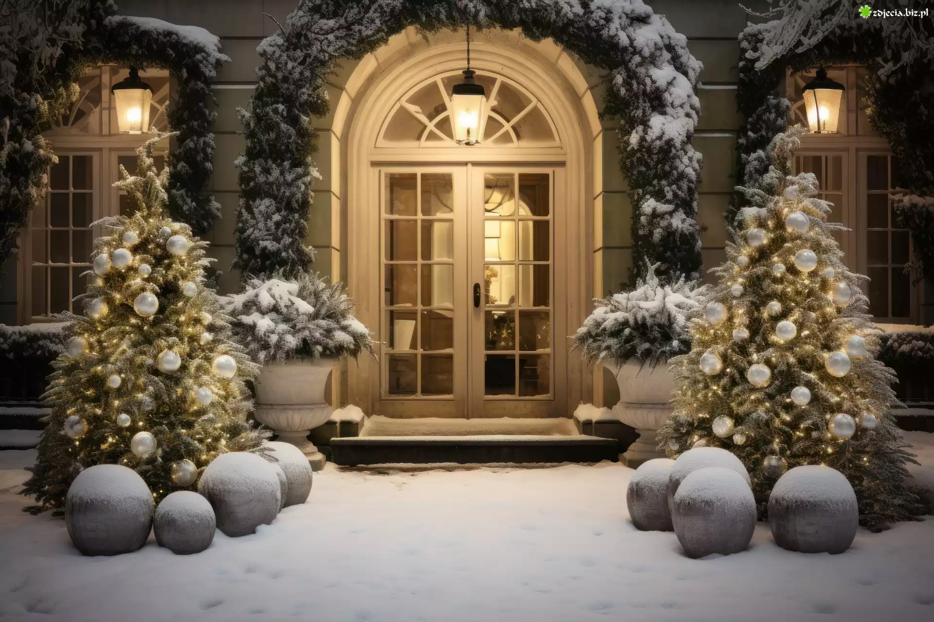 Zdjęcie, Zima, Dom, Choinki, Lampy, Boże Narodzenie