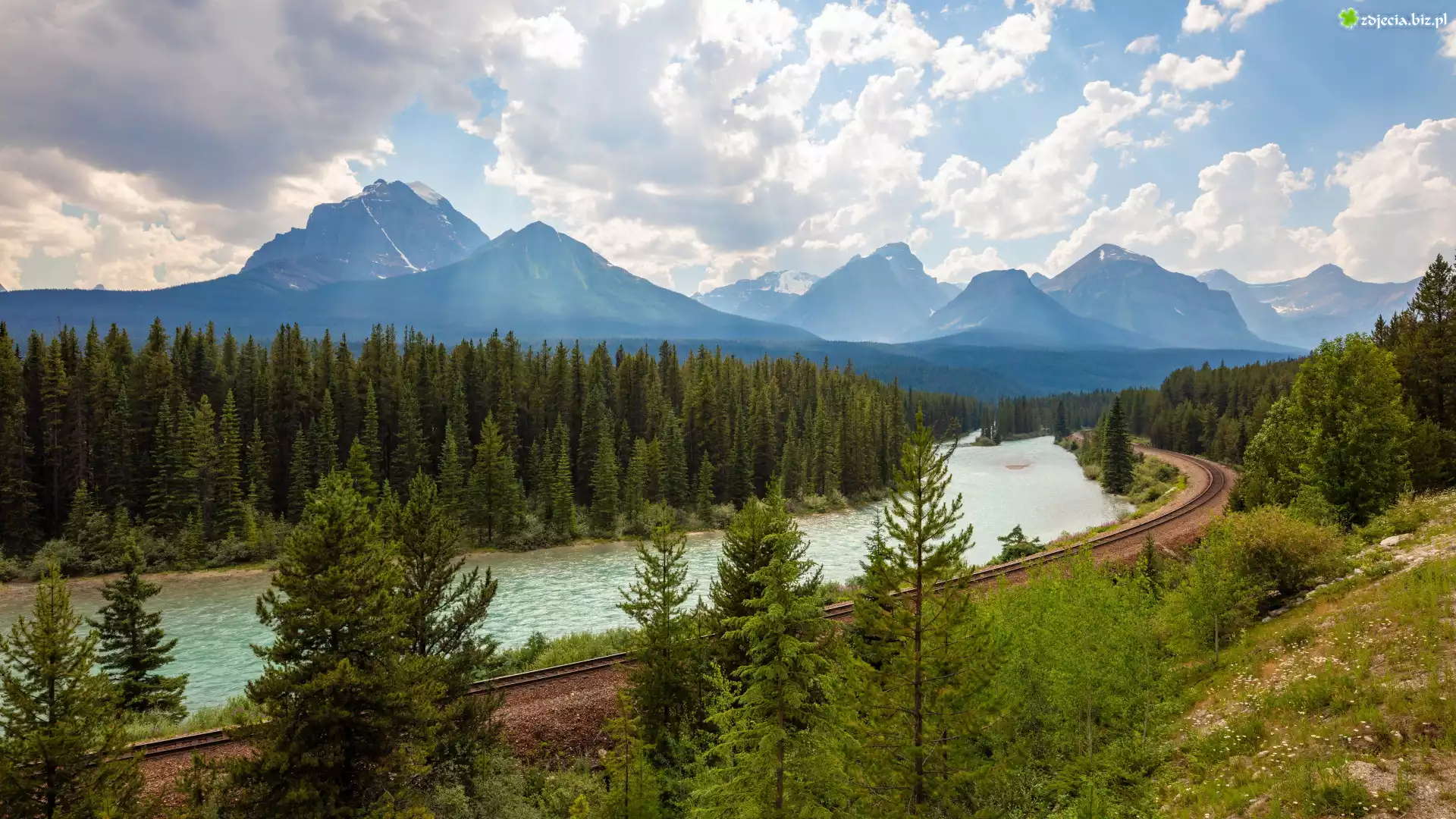 Zdjęcie Park Narodowy Banff, Rzeka, Bow River, Góry Skaliste, Las, Drzewa, Tory, Chmury, Alberta, Kanada |