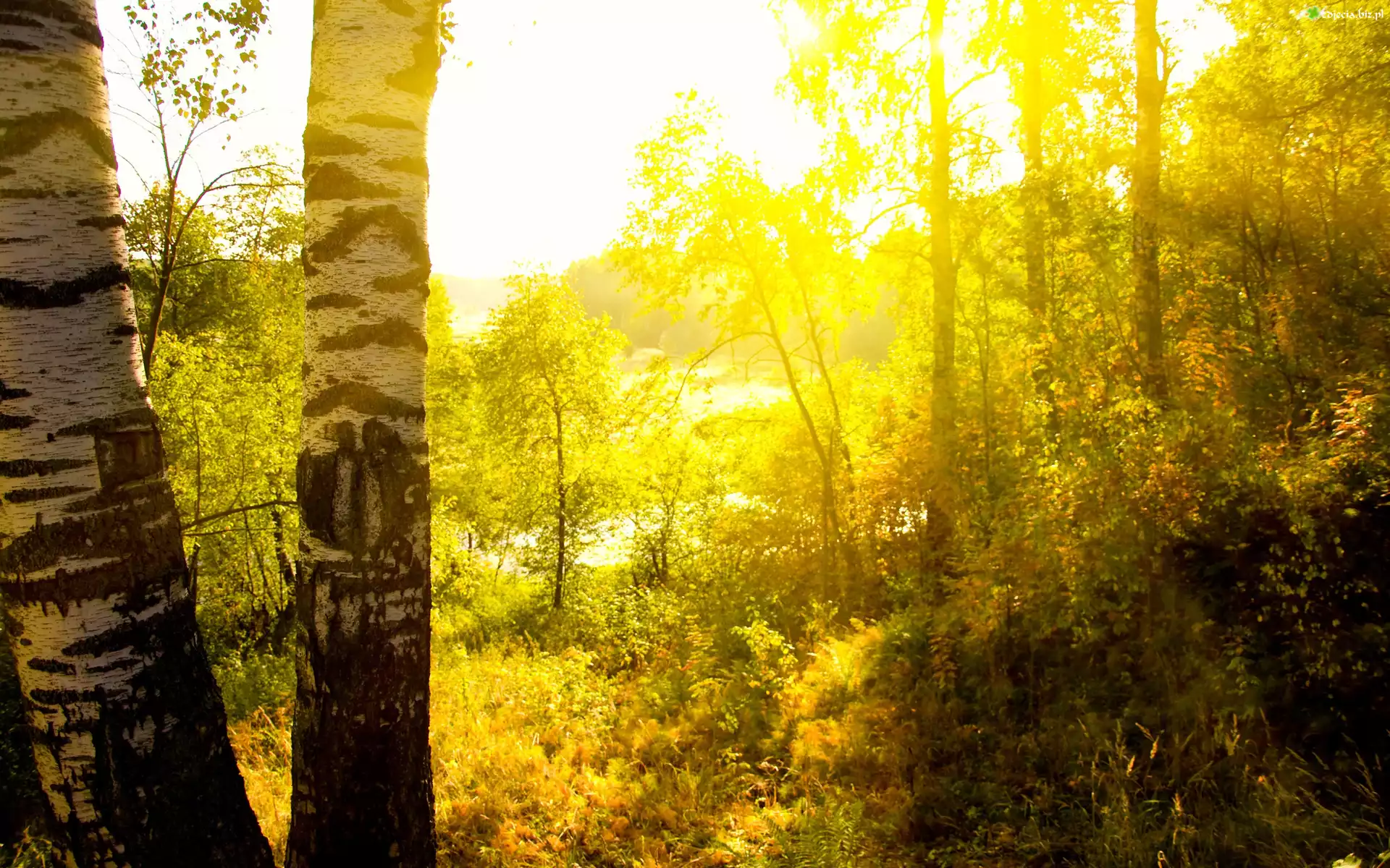 Zdjęcie Las, Drzewa, Brzoza, Paprocie