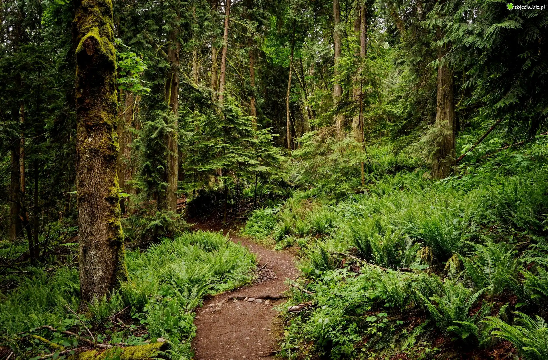 Zdjęcie Las, Drzewa, Ścieżka, Paprocie