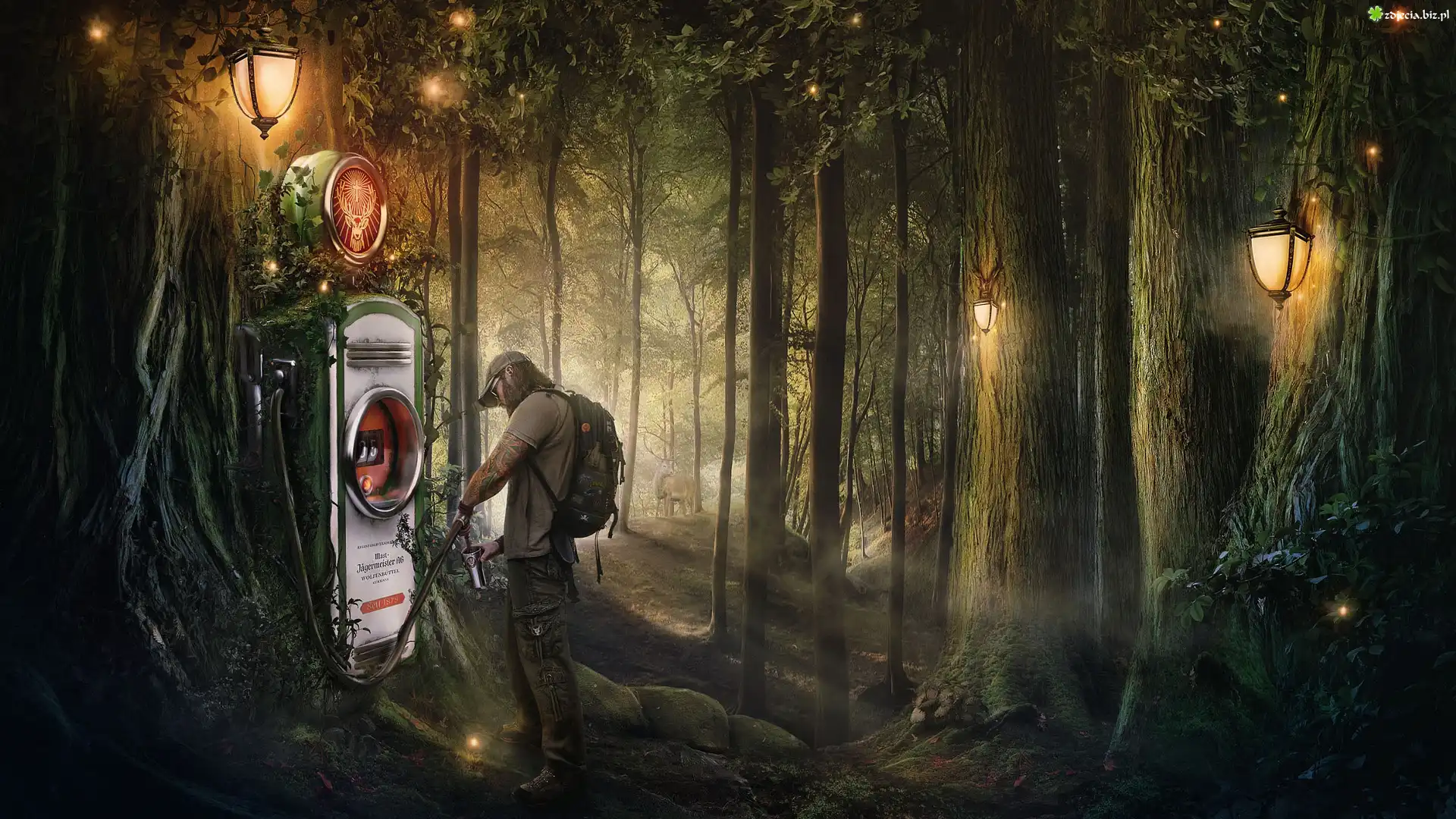 Zdjęcie Las, Drzewa, Lampiony, Człowiek, Dystrybutor
