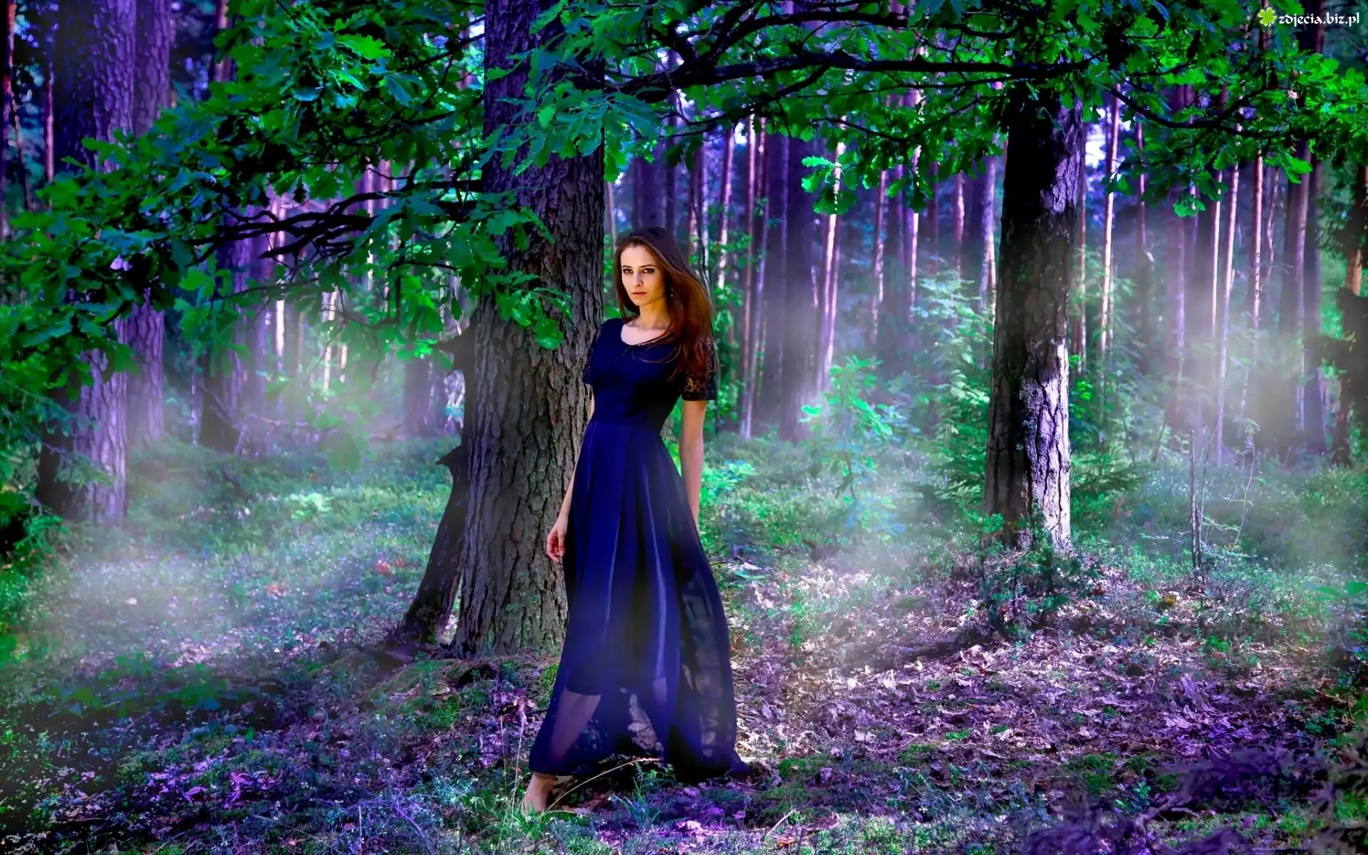 Zdjęcie Las, Kobieta, Niebieska, Długa, Sukienka