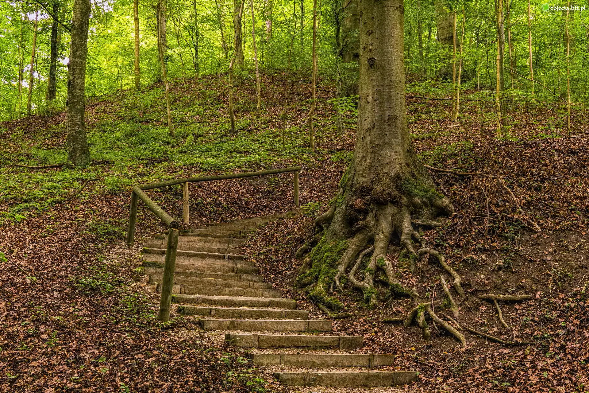 Zdjęcie Las, Drzewa, Korzenie, Liście, Drewniane, Schody