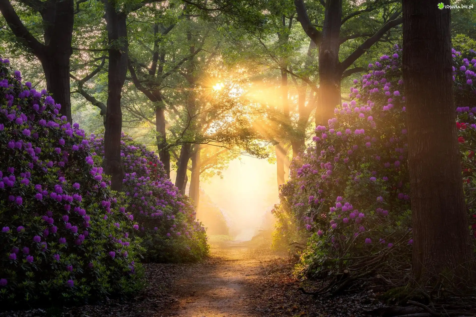 Zdjęcie Las, Drzewa, Przebijające światło, Dróżka, Różaneczniki