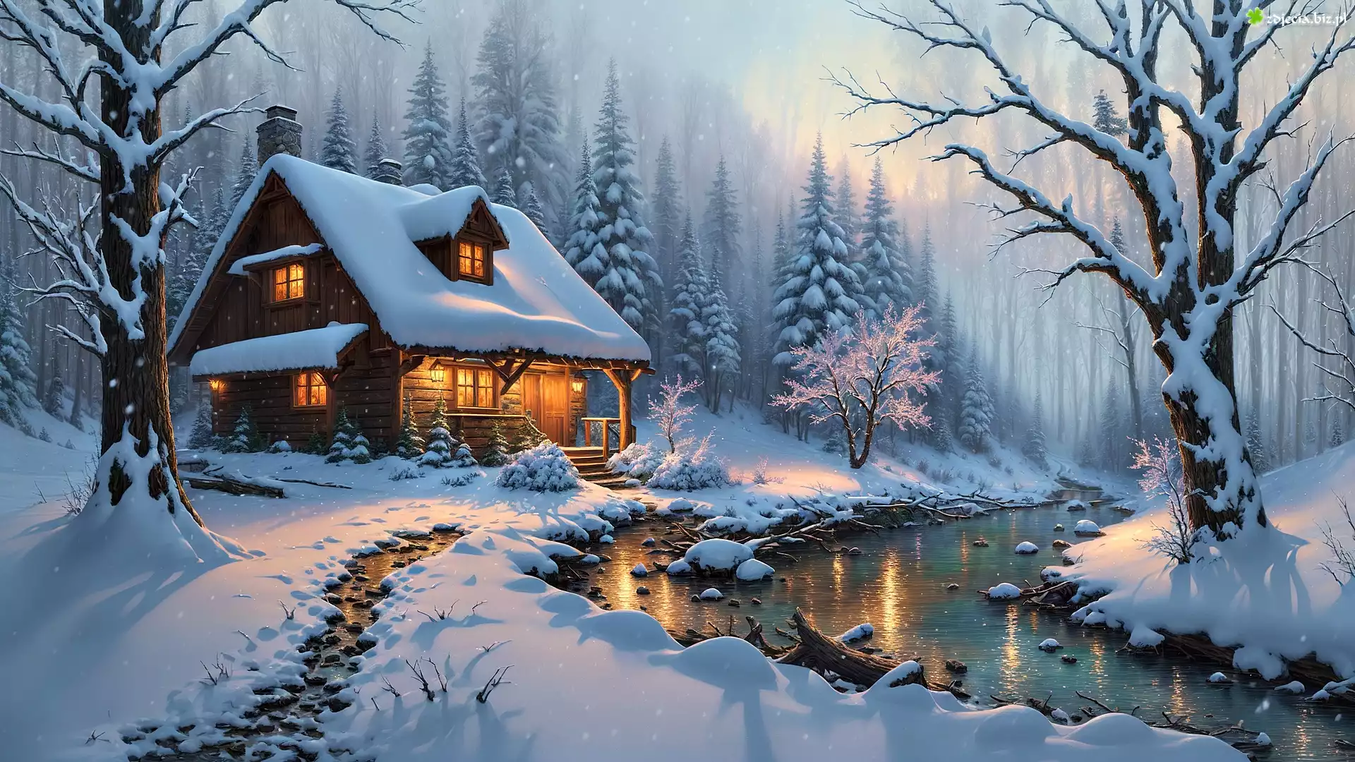 Zdjęcie Zima, Dom, Rzeka, Las, Grafika, Drzewa