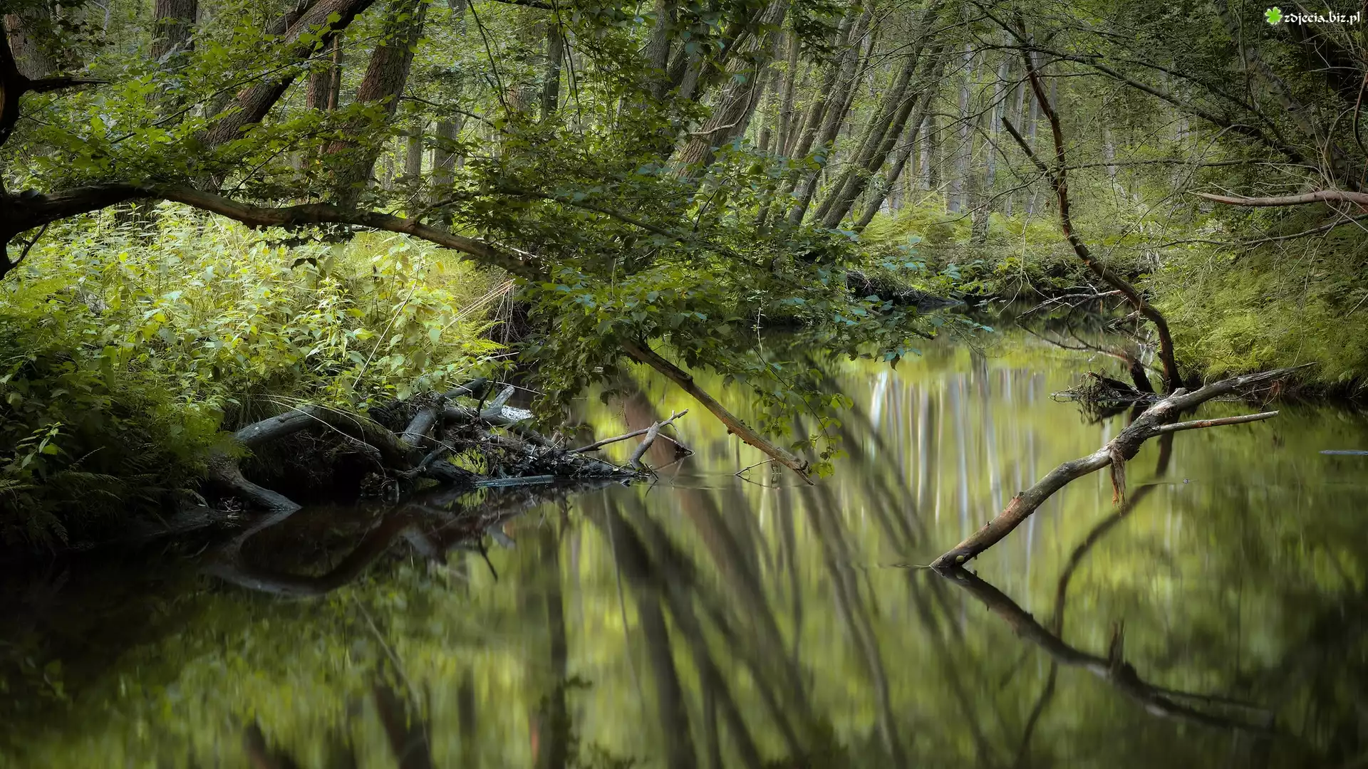 Zdjęcie Las, Drzewa, Staw, Roślinność, Gałęzie, Odbicie