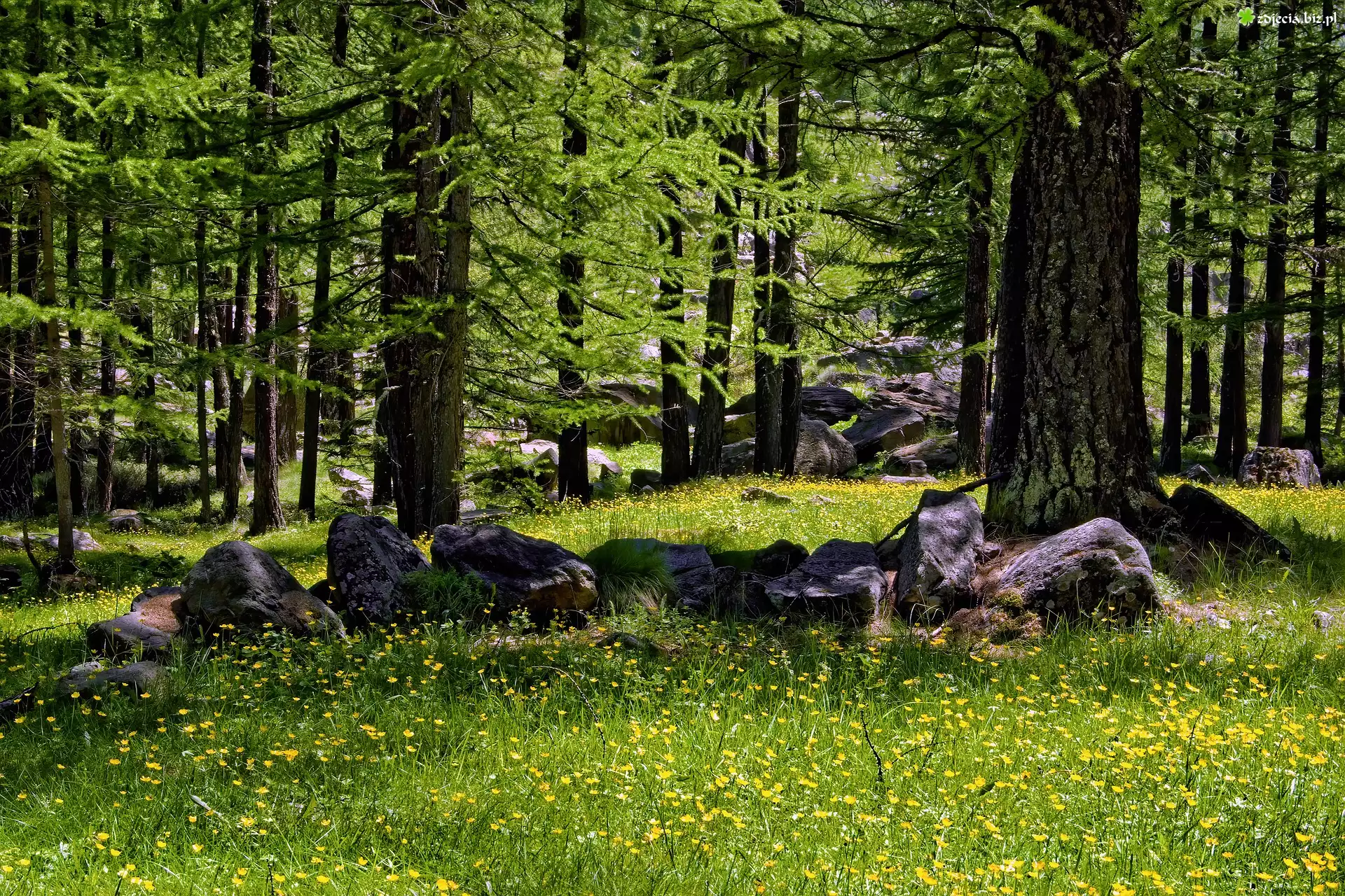 Zdjęcie, Drzewa, Las, Głazy, Kamienie, Kwiaty