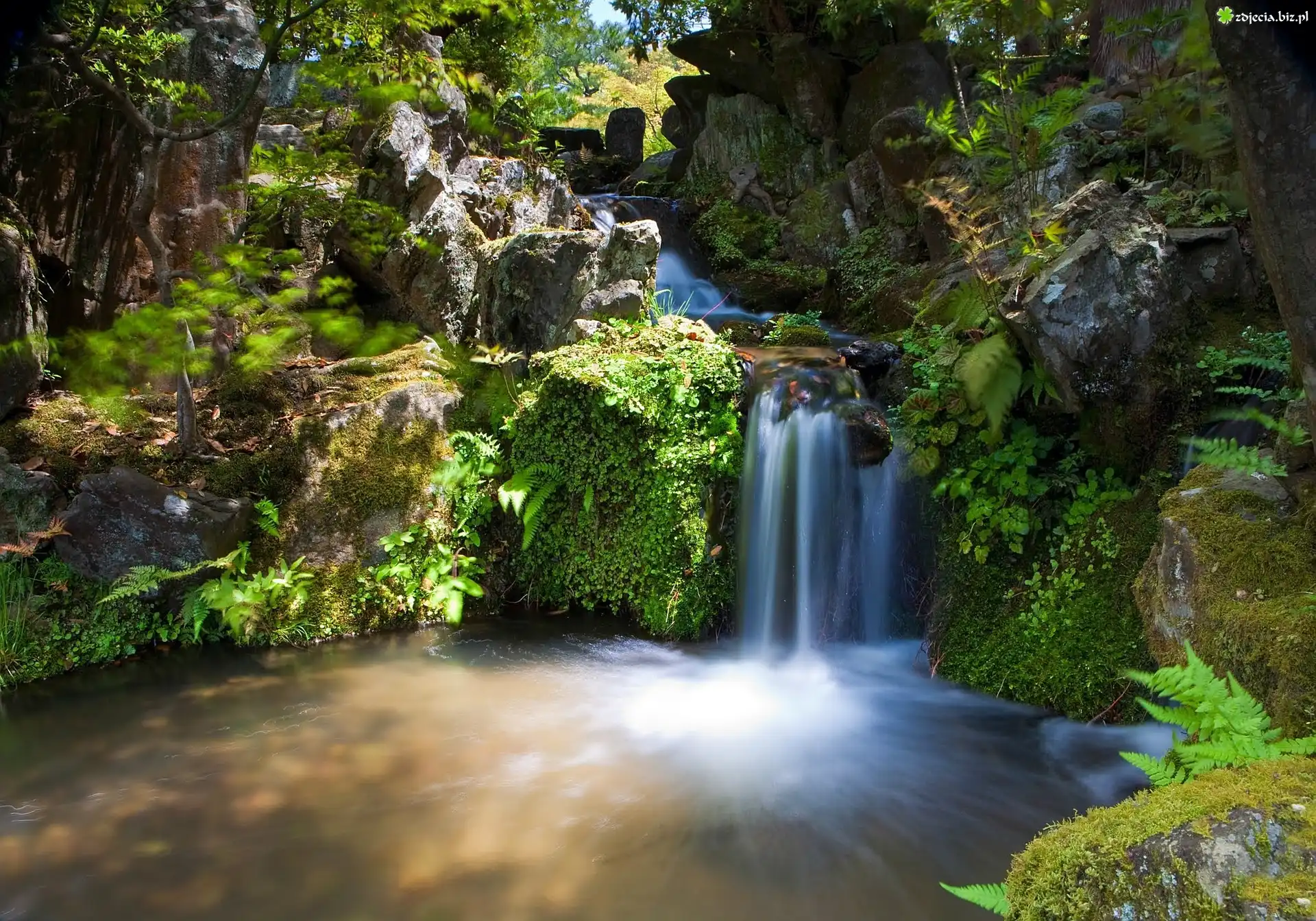 Zdjęcie, Las, Wodospad, Głazy, Paprocie