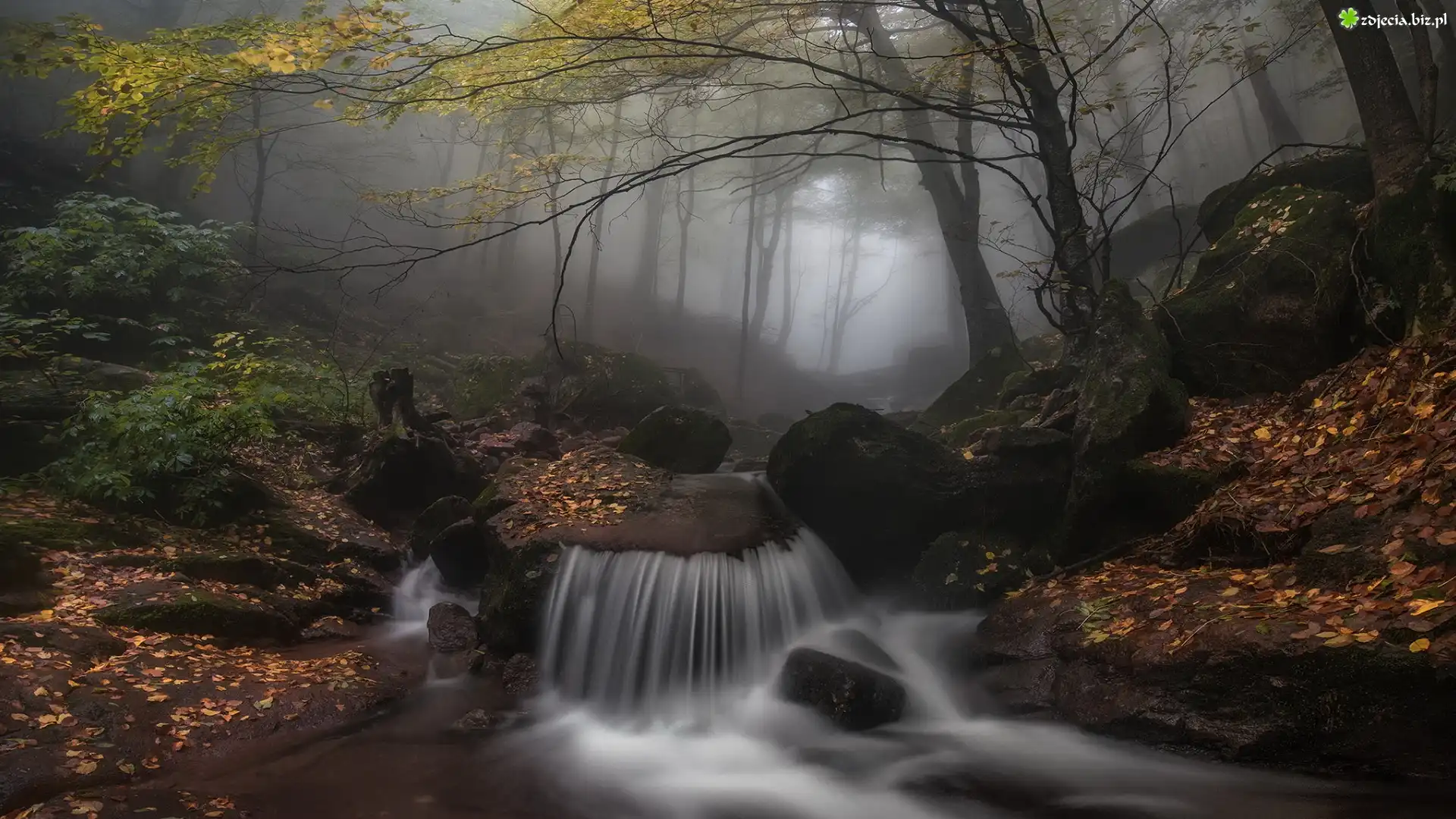 Zdjęcie Jesień, Las, Mgła, Drzewa, Liście, Kamienie, Rzeka