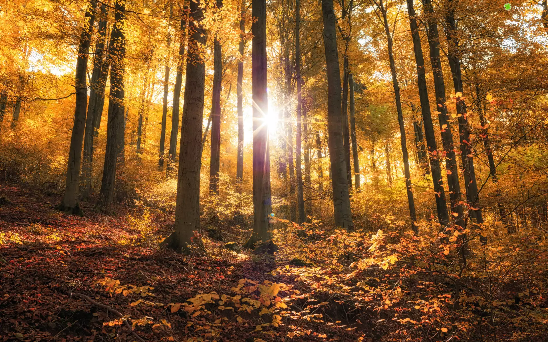 Zdjęcie Promienie słońca, Jesień, Las, Drzewa, Opadłe, Liście