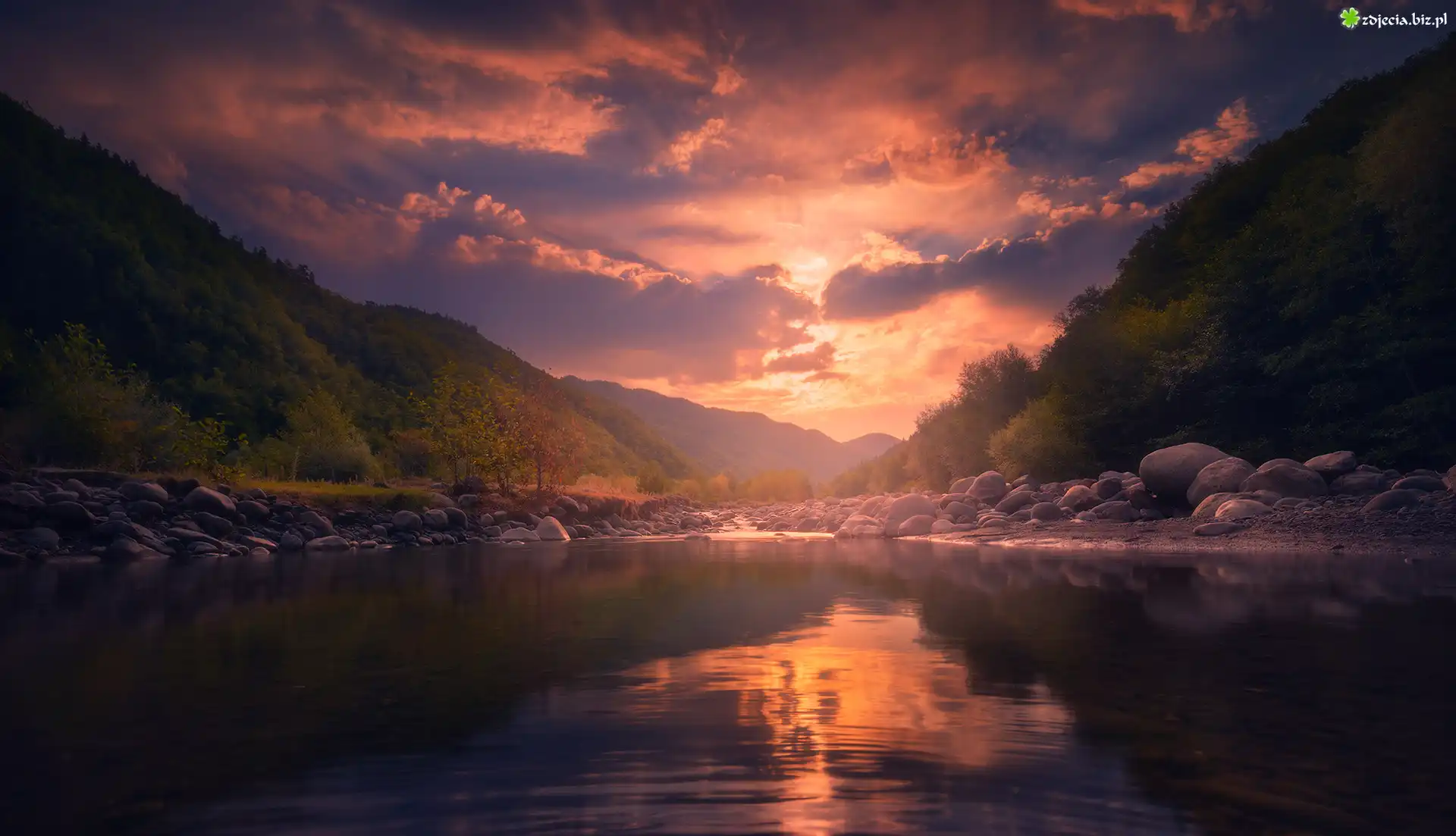 Zdjęcie Jezioro, Las, Drzewa, Kamienie, Zachód słońca, Wzgórza